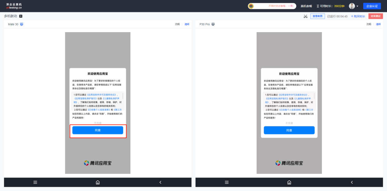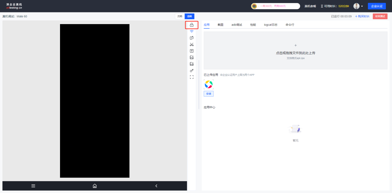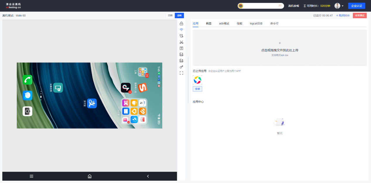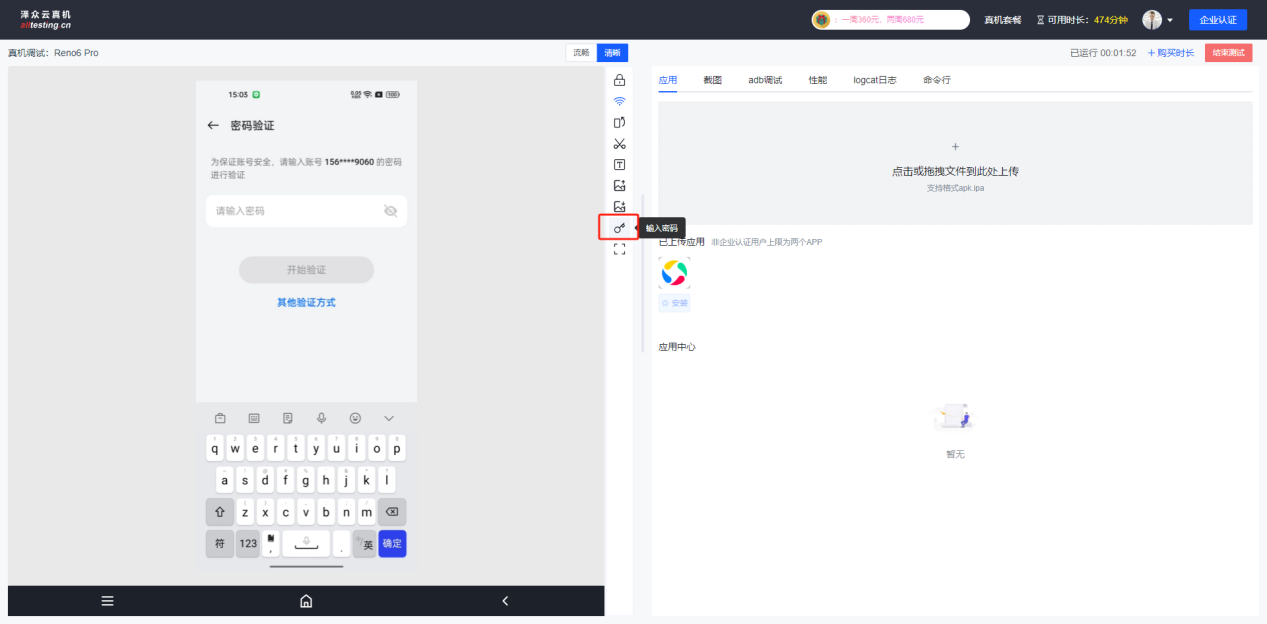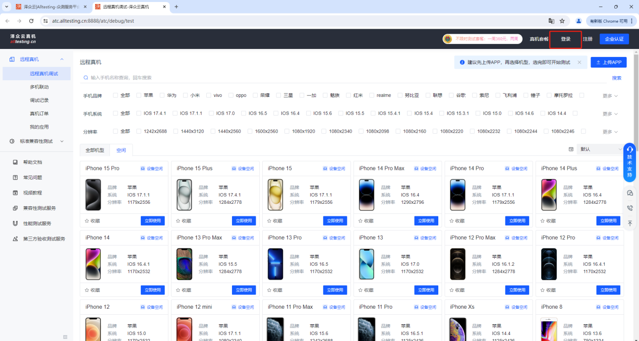 输入用户名密码即可登录到云真机测试平台进行测试