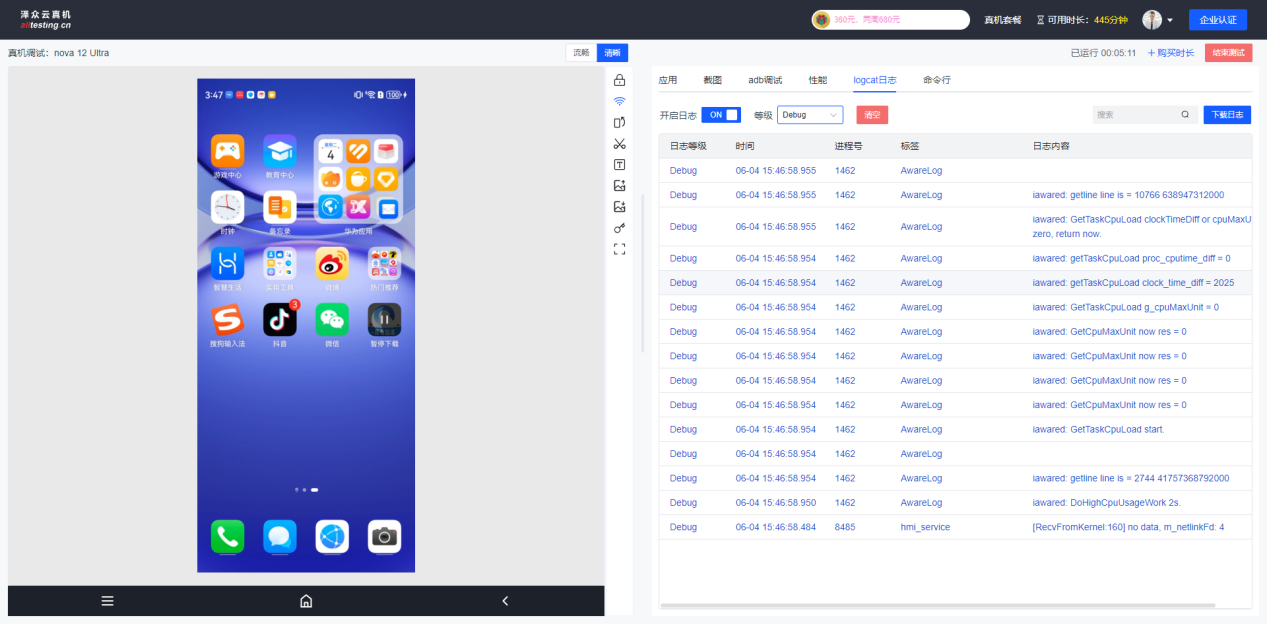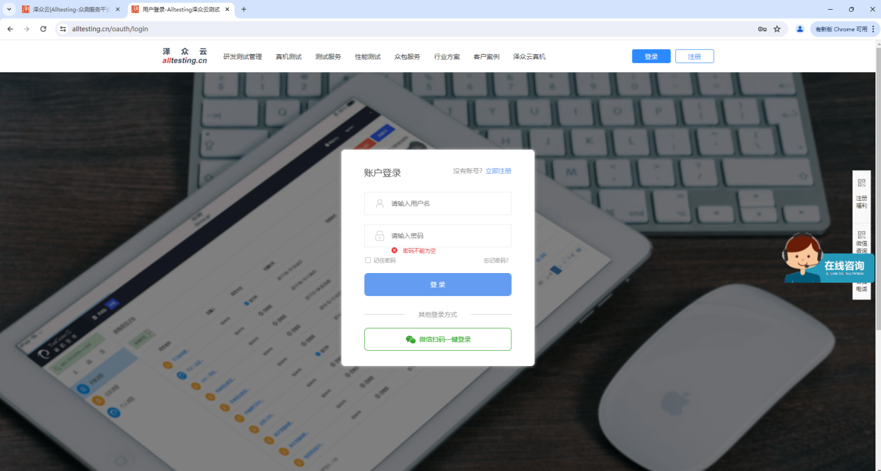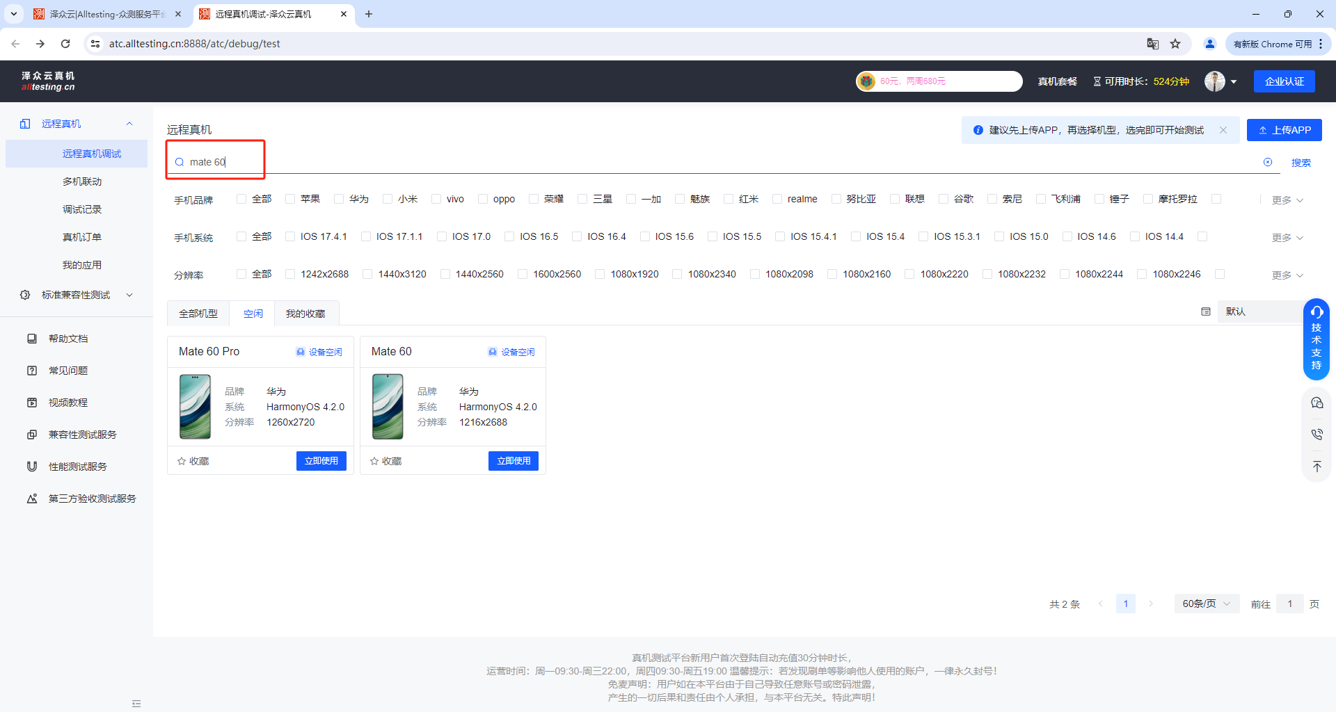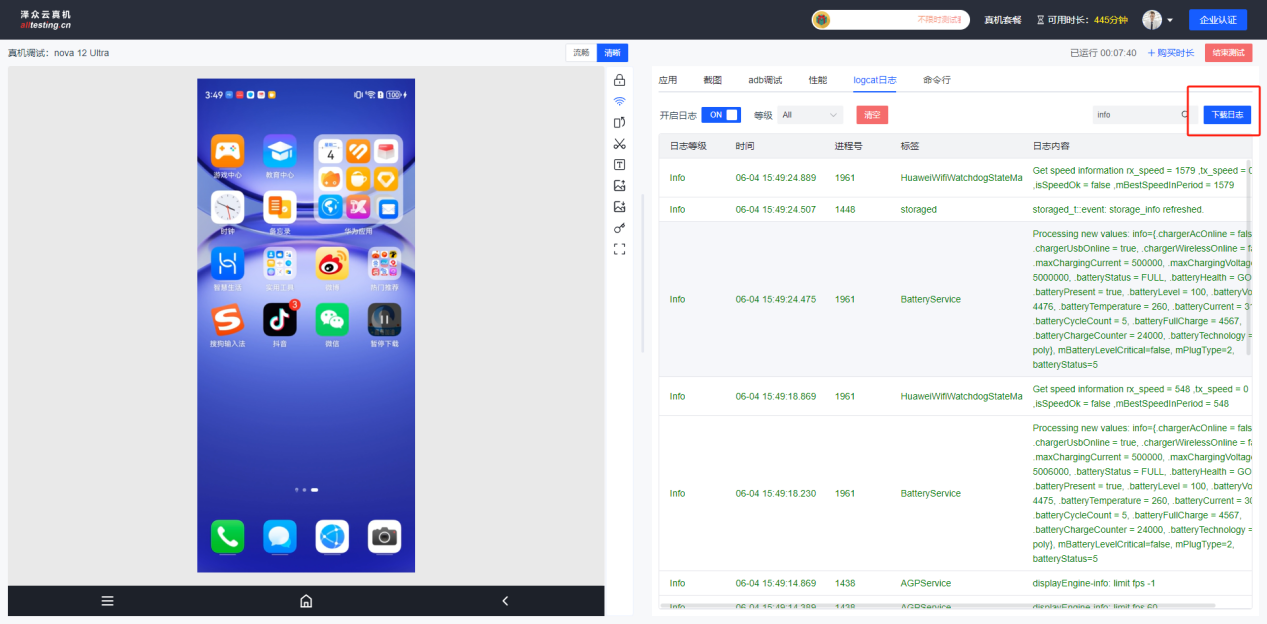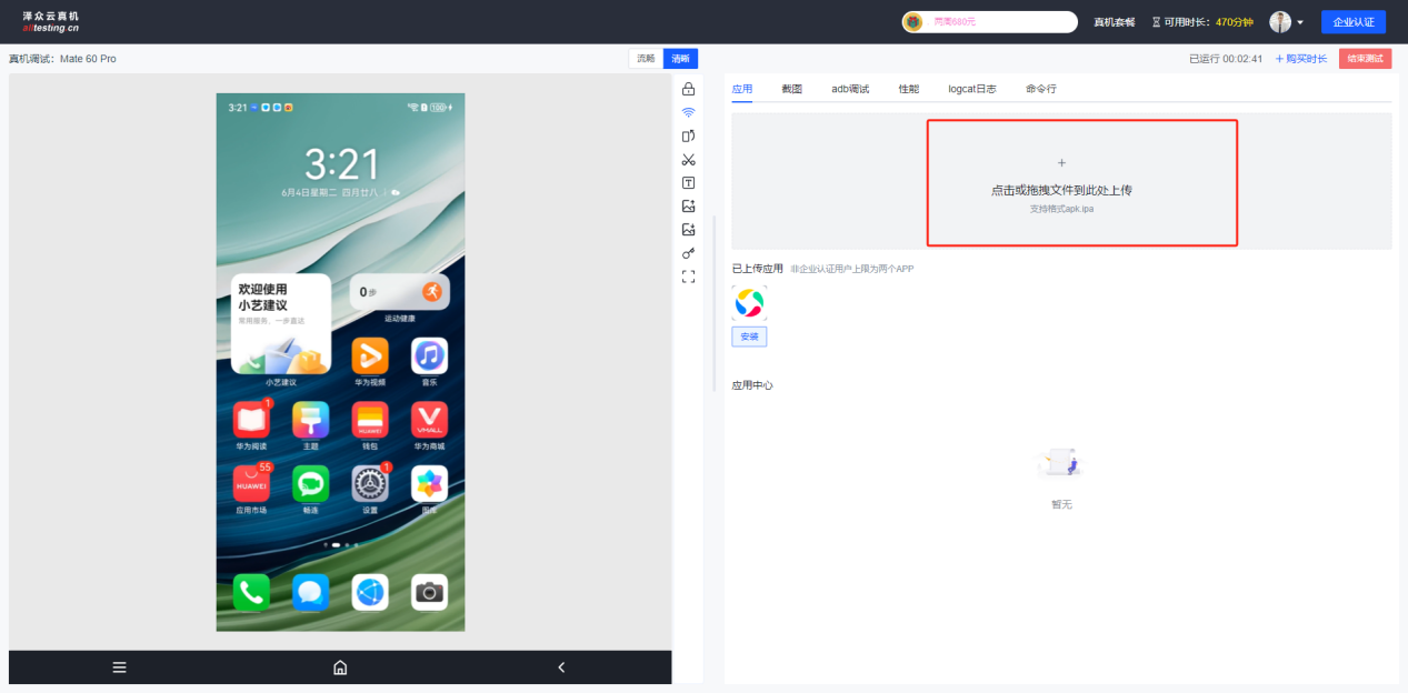 输入用户名密码即可登录到云真机测试平台进行测试