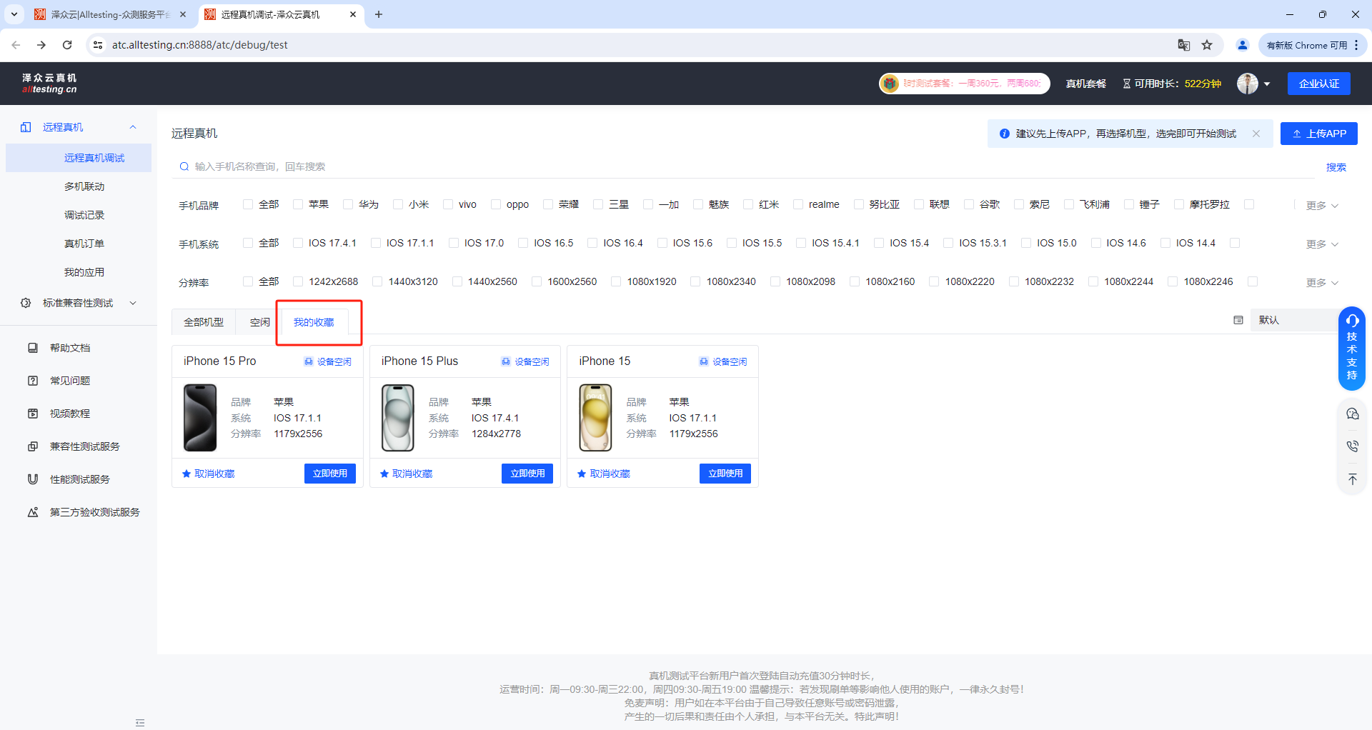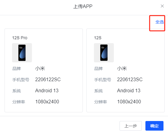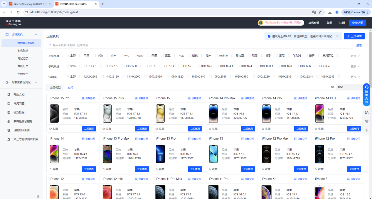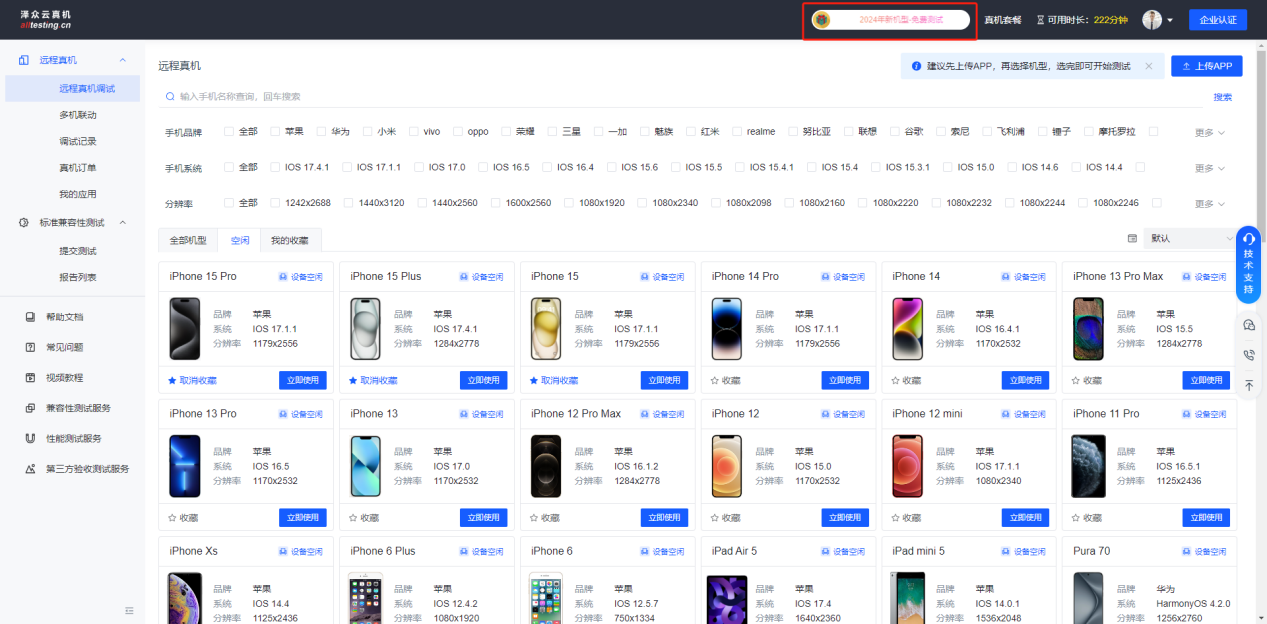 为方便用户使用,可通过手机品牌、系统、分辨率等快速筛选出需要测试的机型