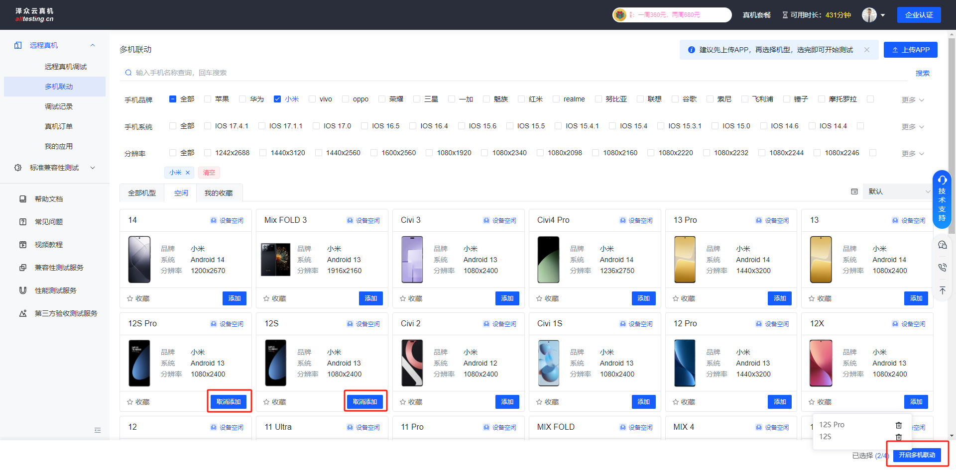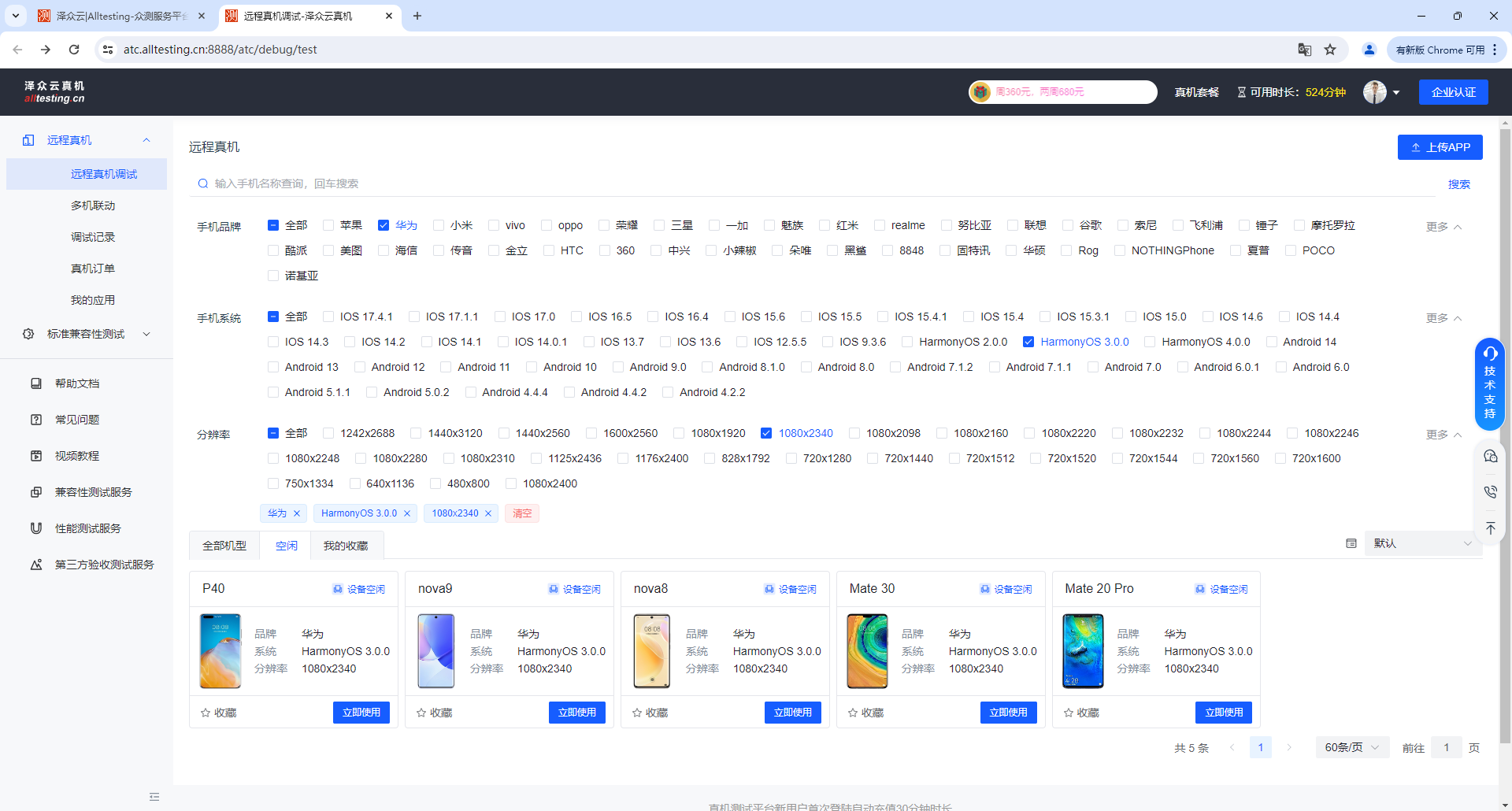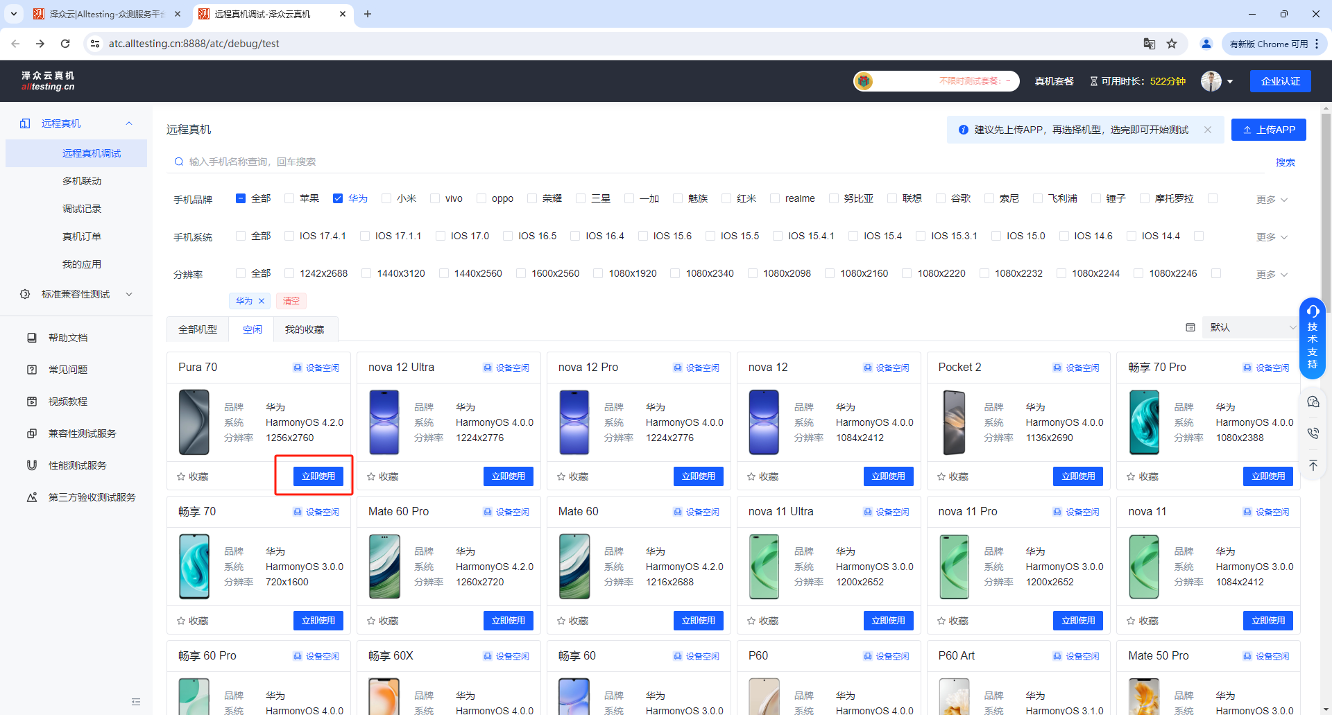 为方便用户使用,可通过手机品牌、系统、分辨率等快速筛选出需要测试的机型