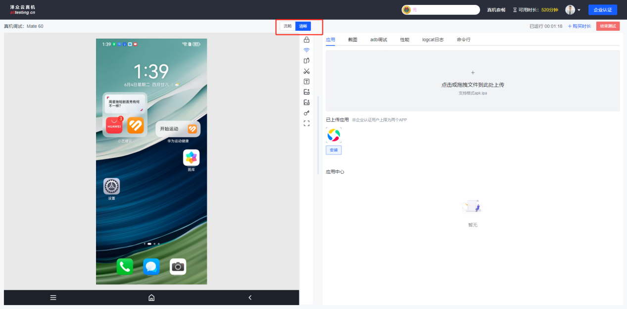点击真机界面上方“流畅/清晰”按钮即可切换界面清晰度;