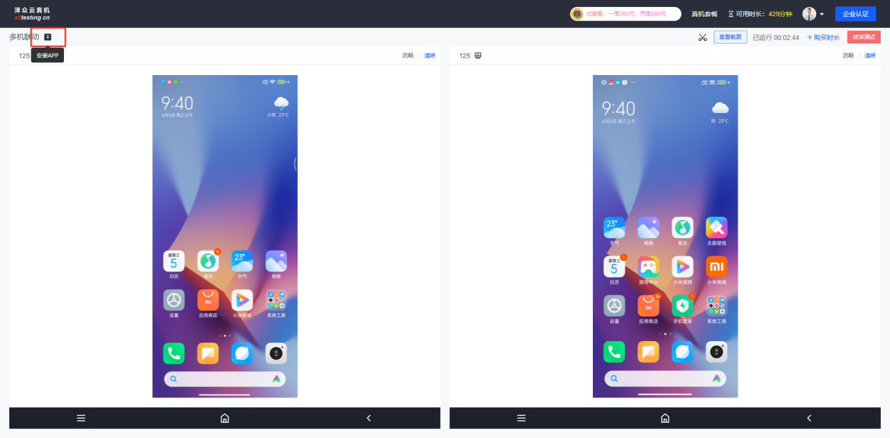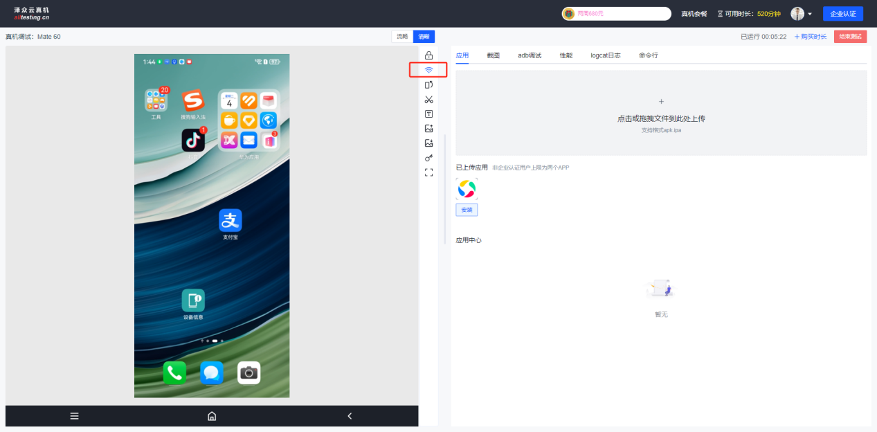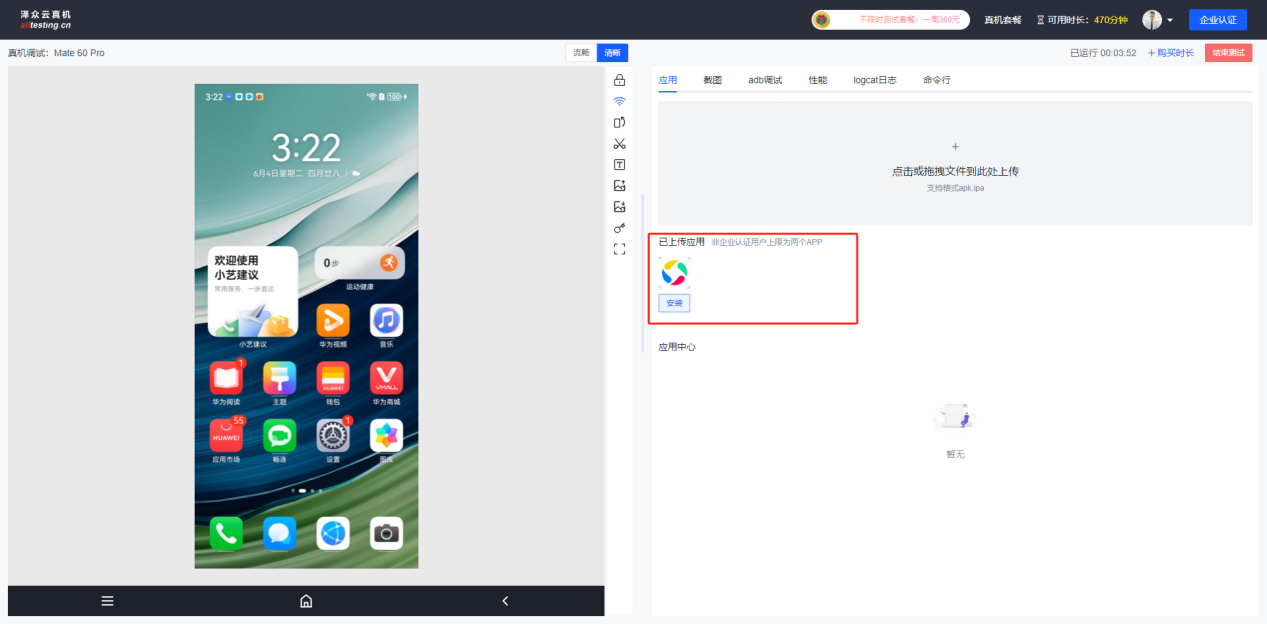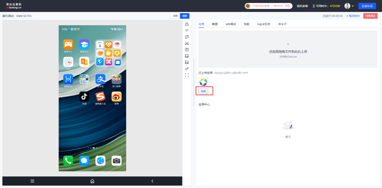 点击“安装”按钮即可将上传的APP安装到真机中;