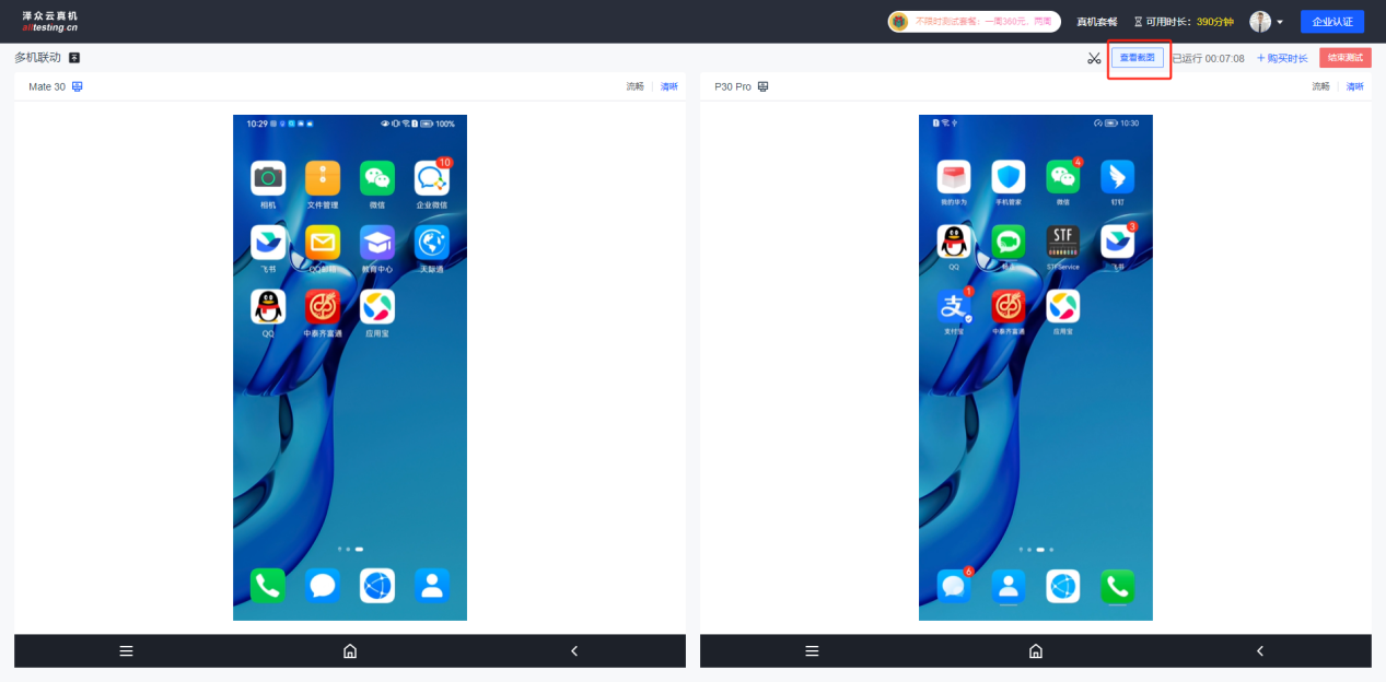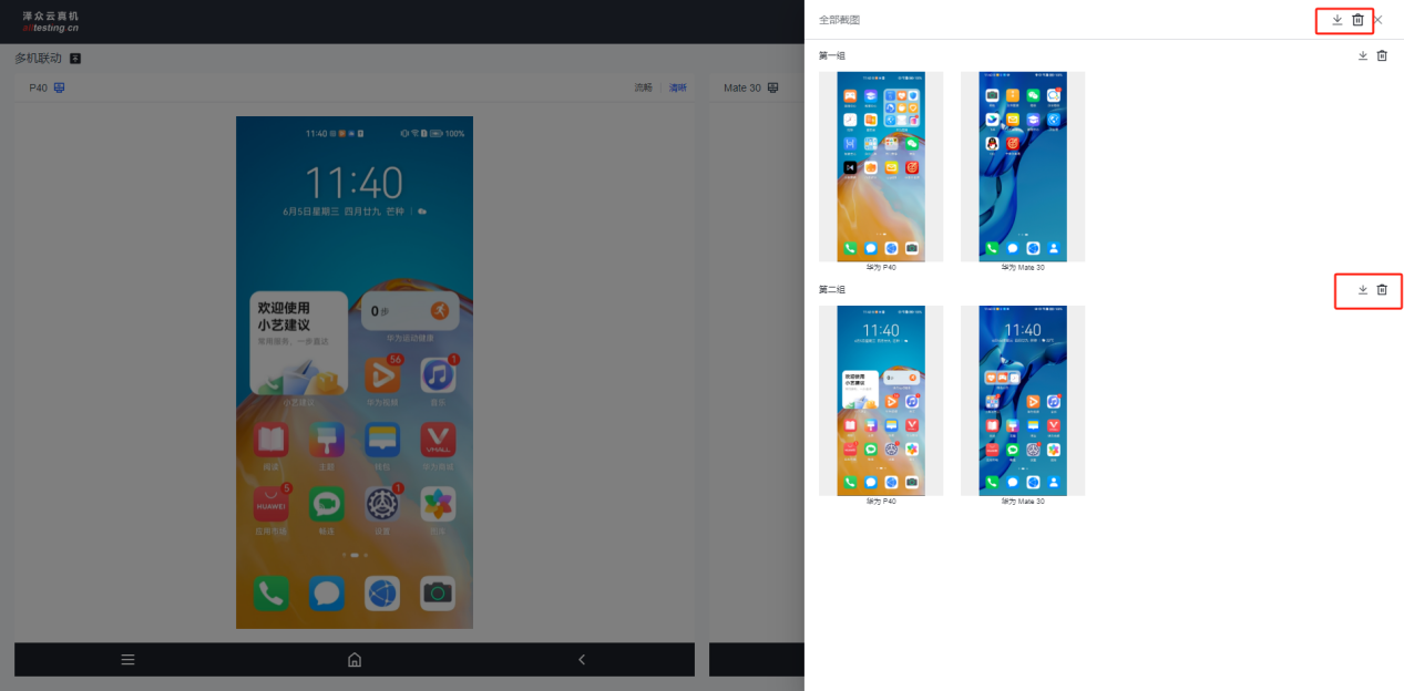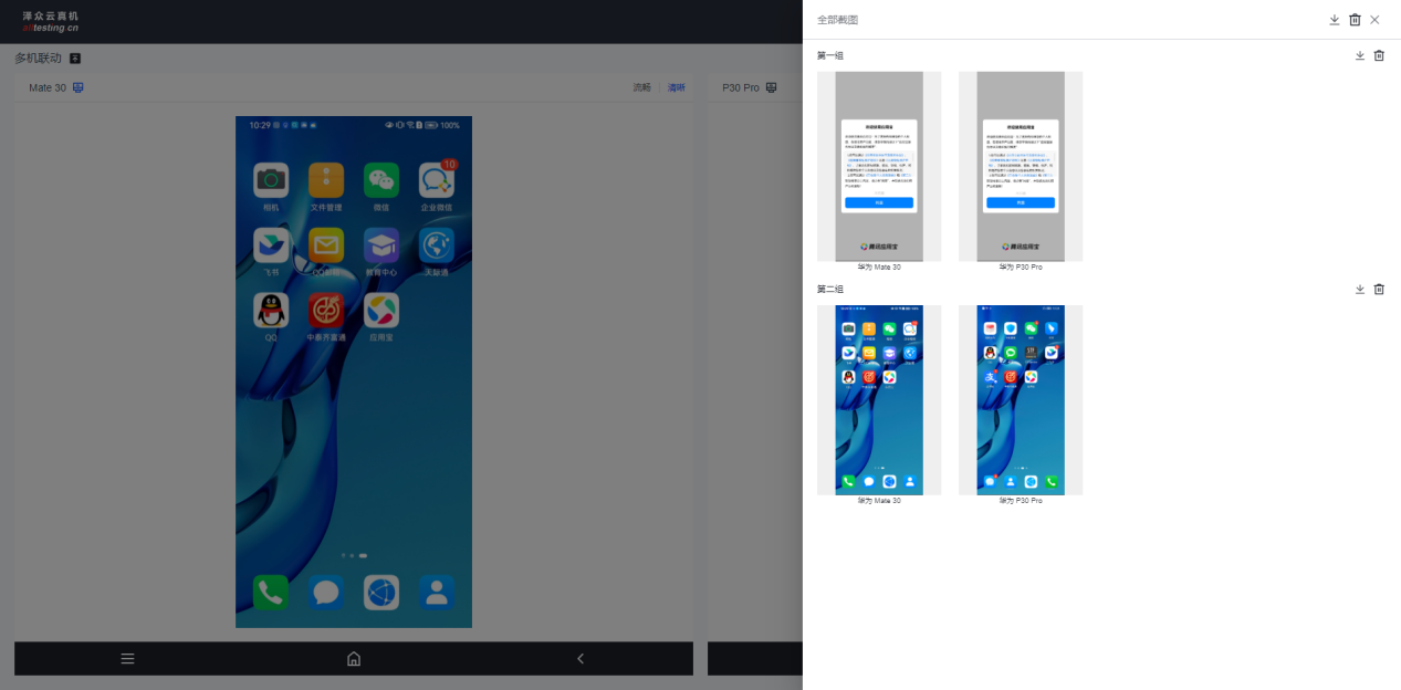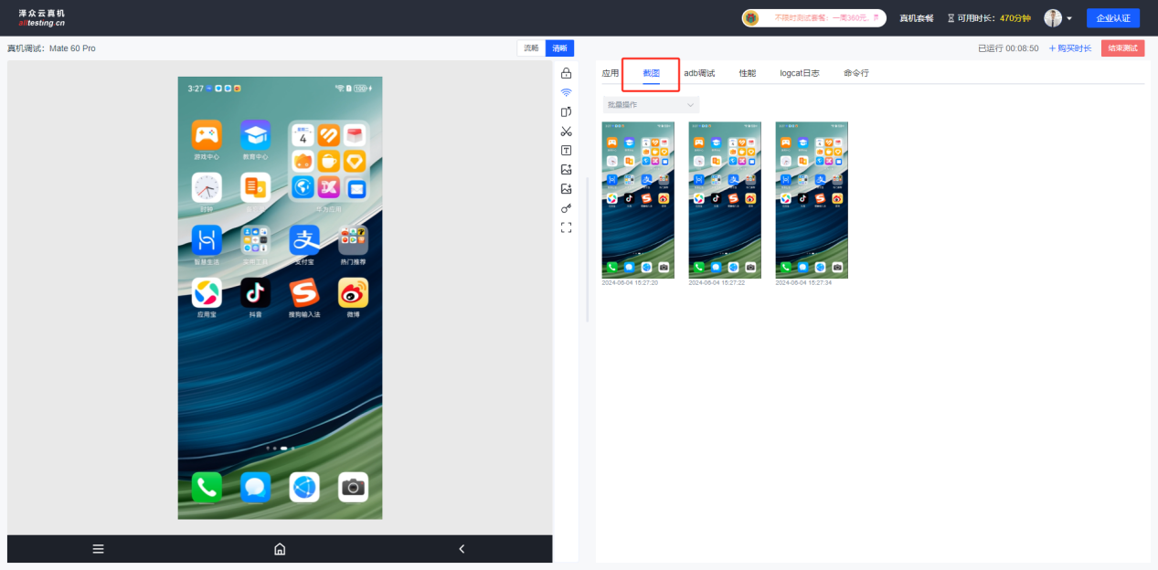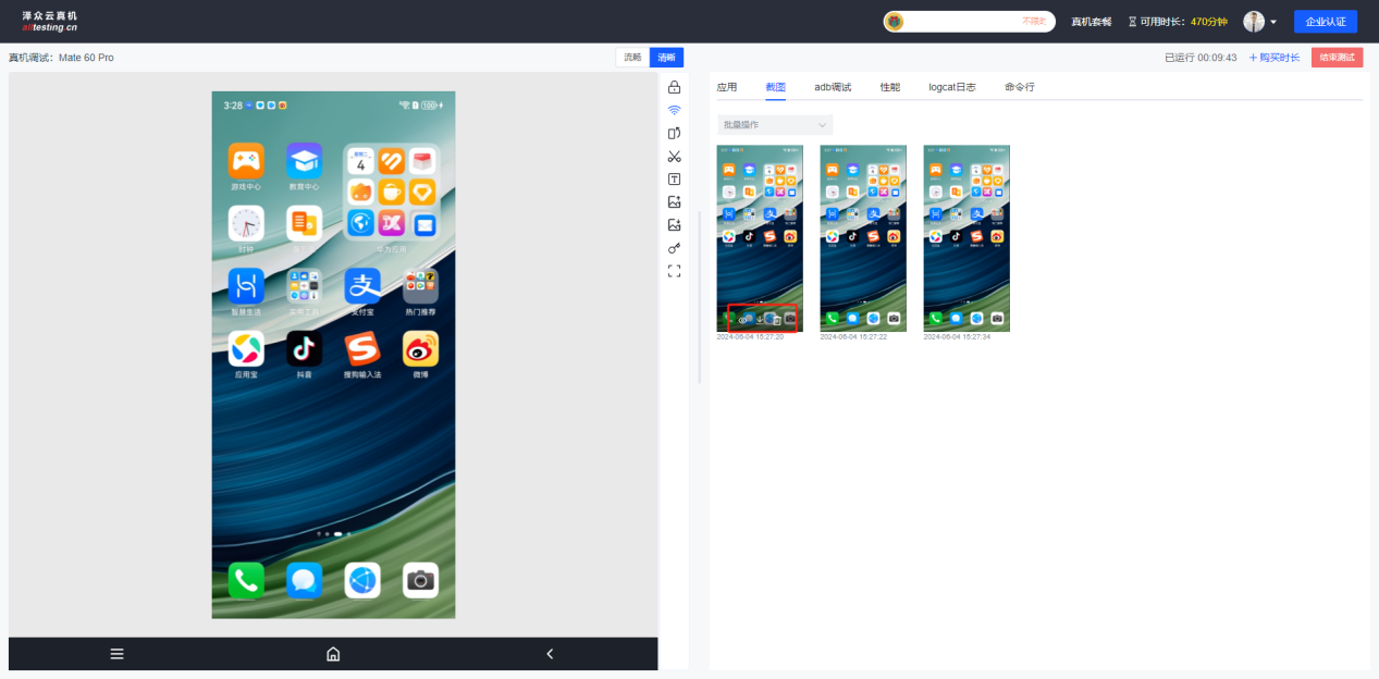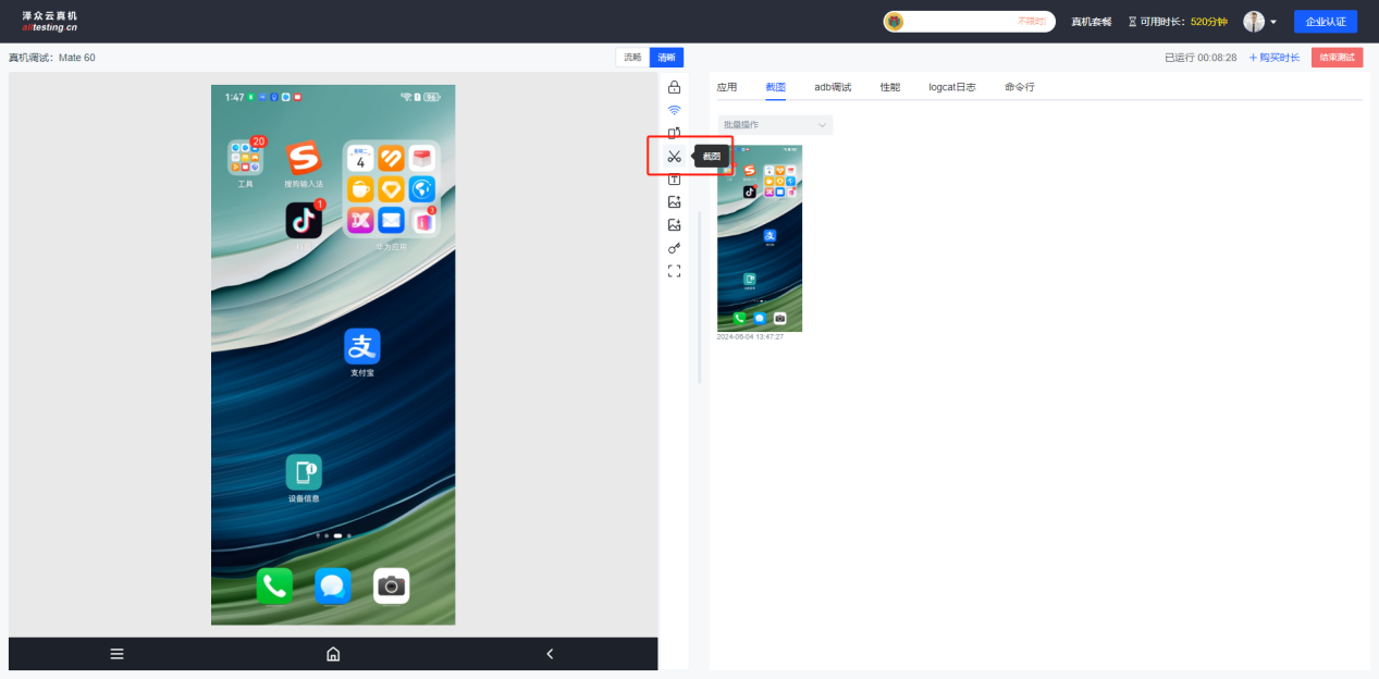 点击真机界面右侧“截图”按钮即可对真机进行截图操作,截取的图片会显示在右侧截图列表中;