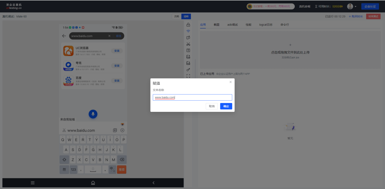 点击真机界面右侧“赋值”按钮,即可将本地文本复制到真机输入框中;