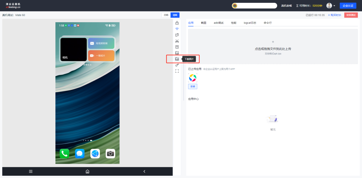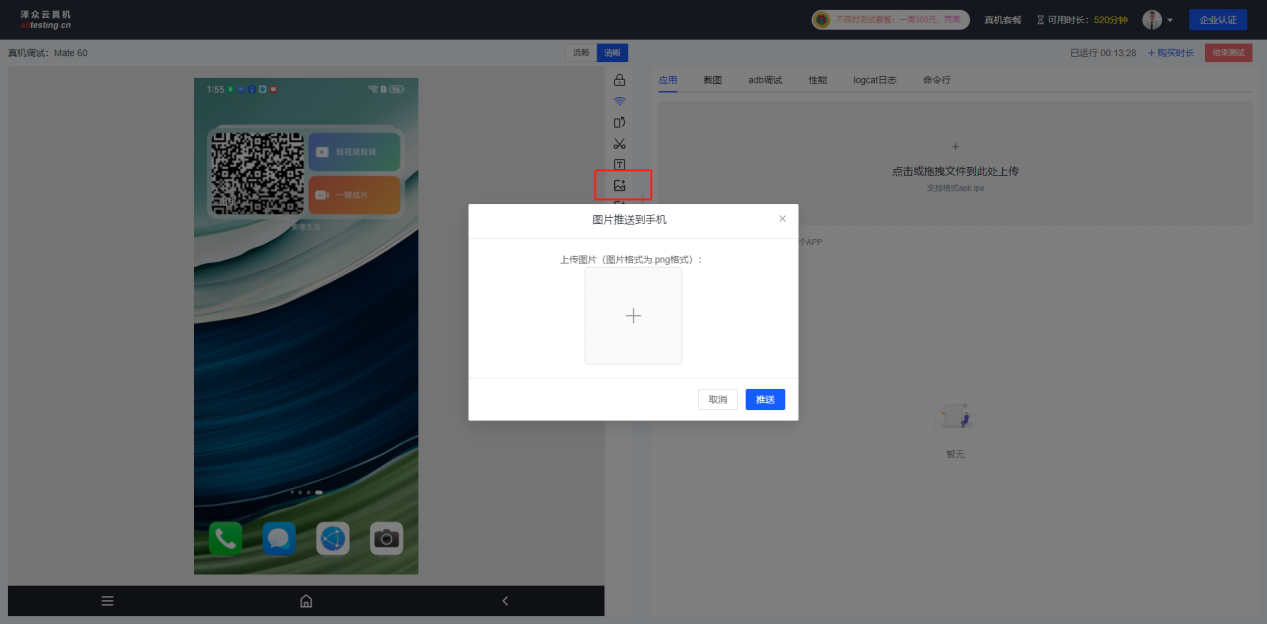 点击真机界面右侧“上传图片”按钮即可将本地图片推送到真机相册中;
