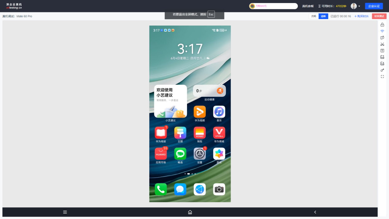 点击真机界面右侧“放大”按钮即可全屏展示真机界面;