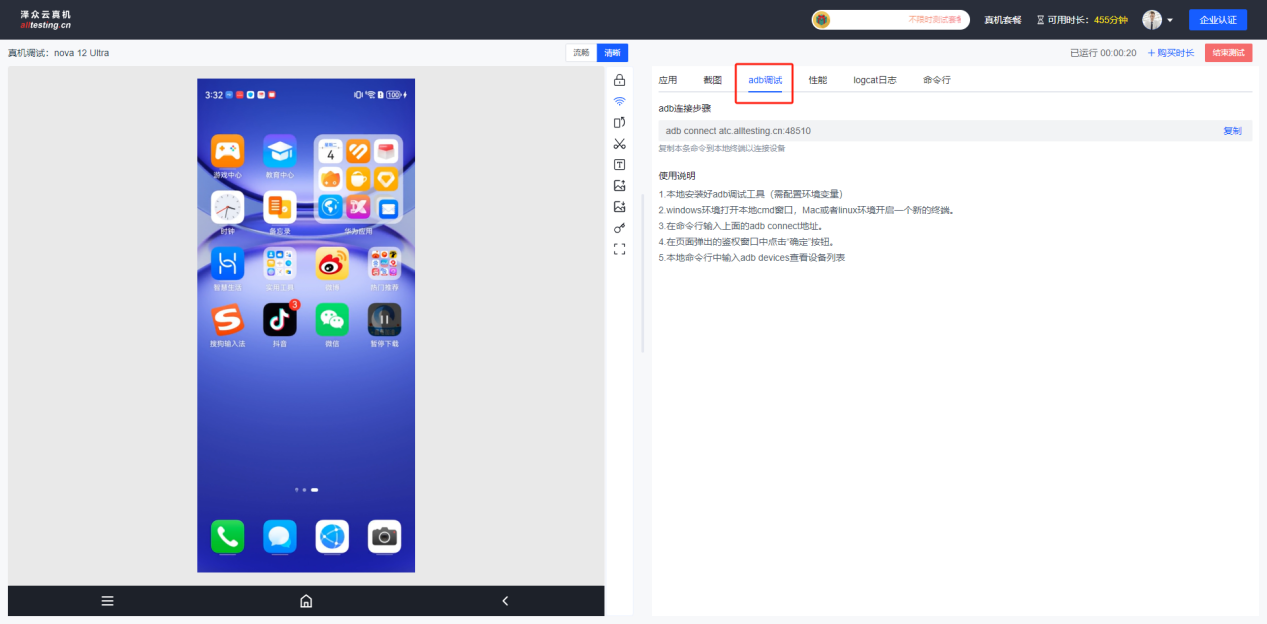 点击“adb调试”按钮按照界面连接步骤和操作说明即可开始adb远程调试;
