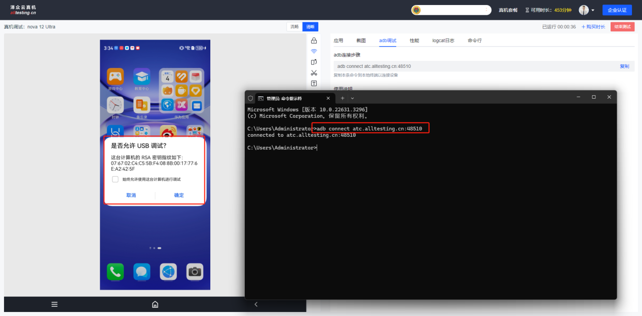 复制命令到本地adb环境中点击确定,连接成功后即可开启远程adb调试;