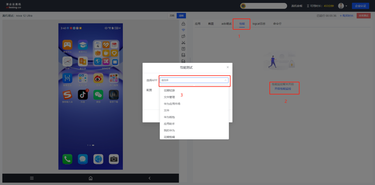 点击“性能”-“开启性能监控”-“选择APP”,即可开启性能测试