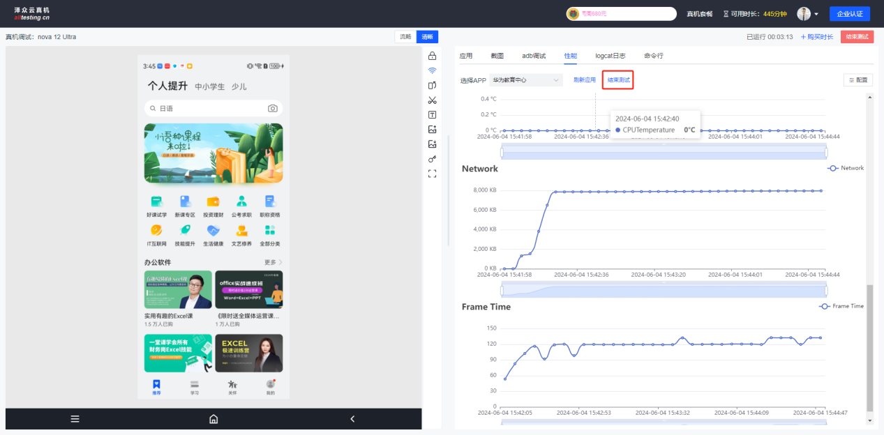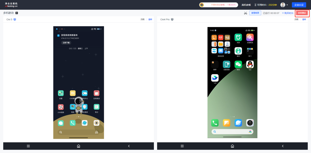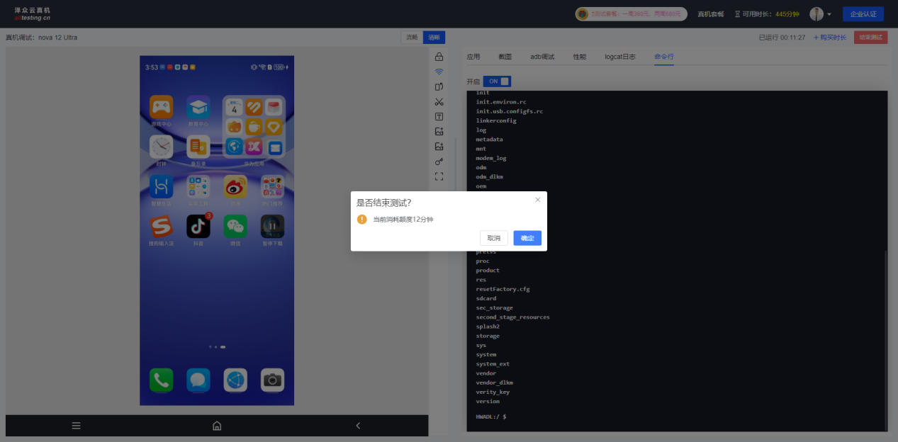 点击“结束测试”按钮弹出是否结束测试提醒,并提示此次调试消耗时长,点击确定后结束测试回到云真机首页;