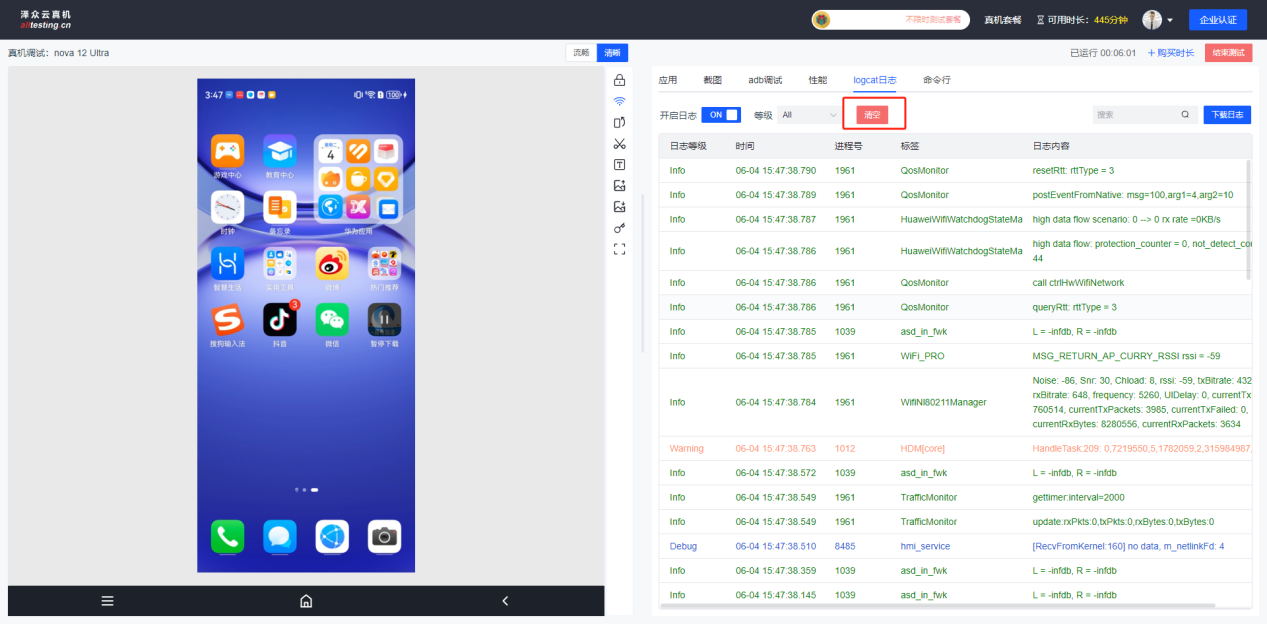 点击“logcat日志”-“开启日志”,即可查看真机系统日志;