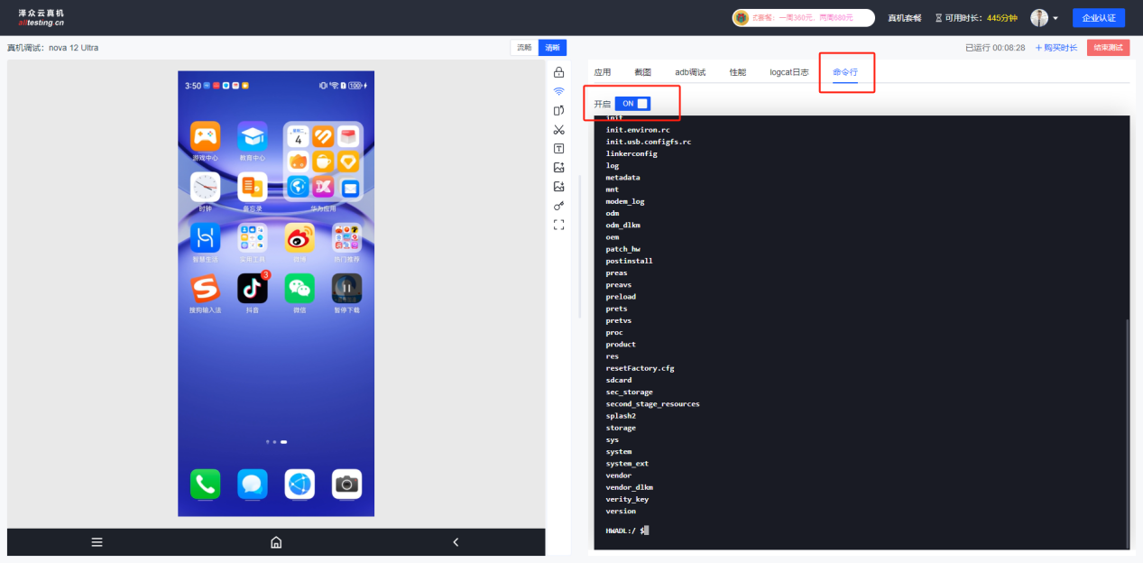 点击“命令行”-“开启”,即可进入到真机命令行界面,通过命令进行操作真机;