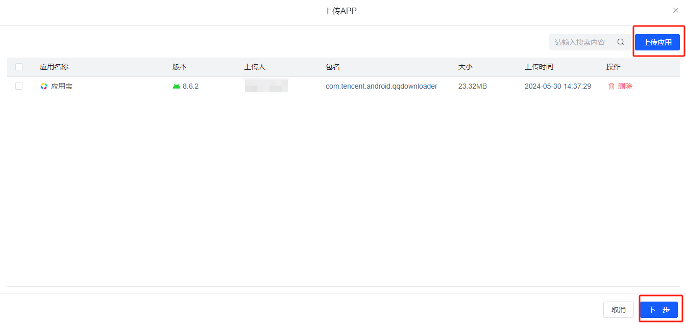 点击“上传”按钮可首先对APP进行上传,已上传的APP会显示在应用列表中,选择需要安装的应用后,点击“下一步”按钮可继续执行APP的安装操作;