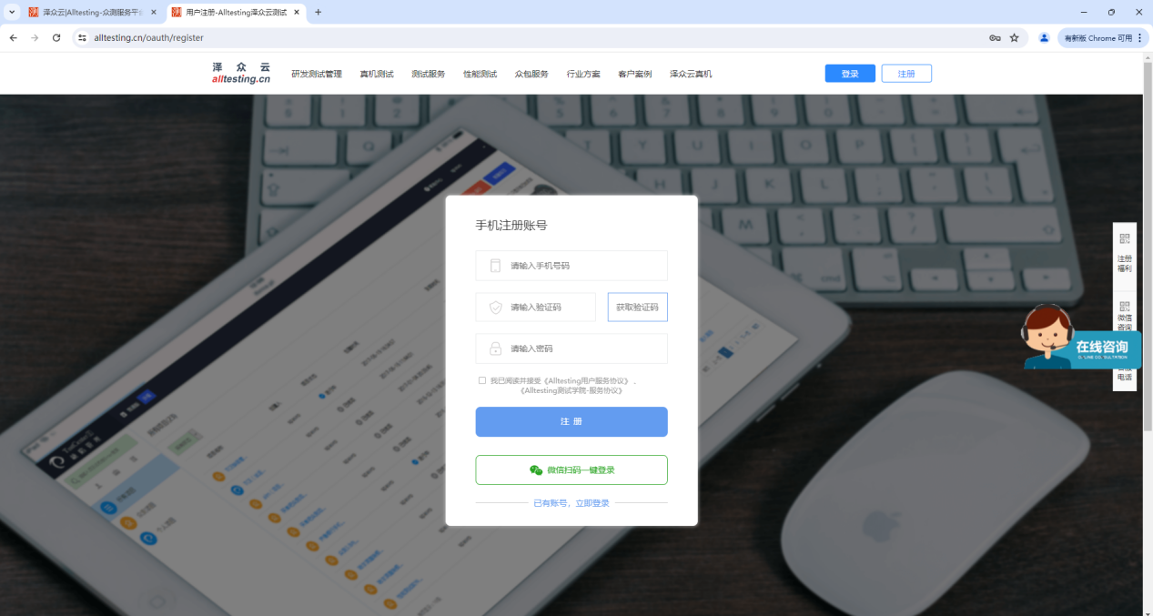 点击云真机测试界面右上角“注册”按钮进行账号注册