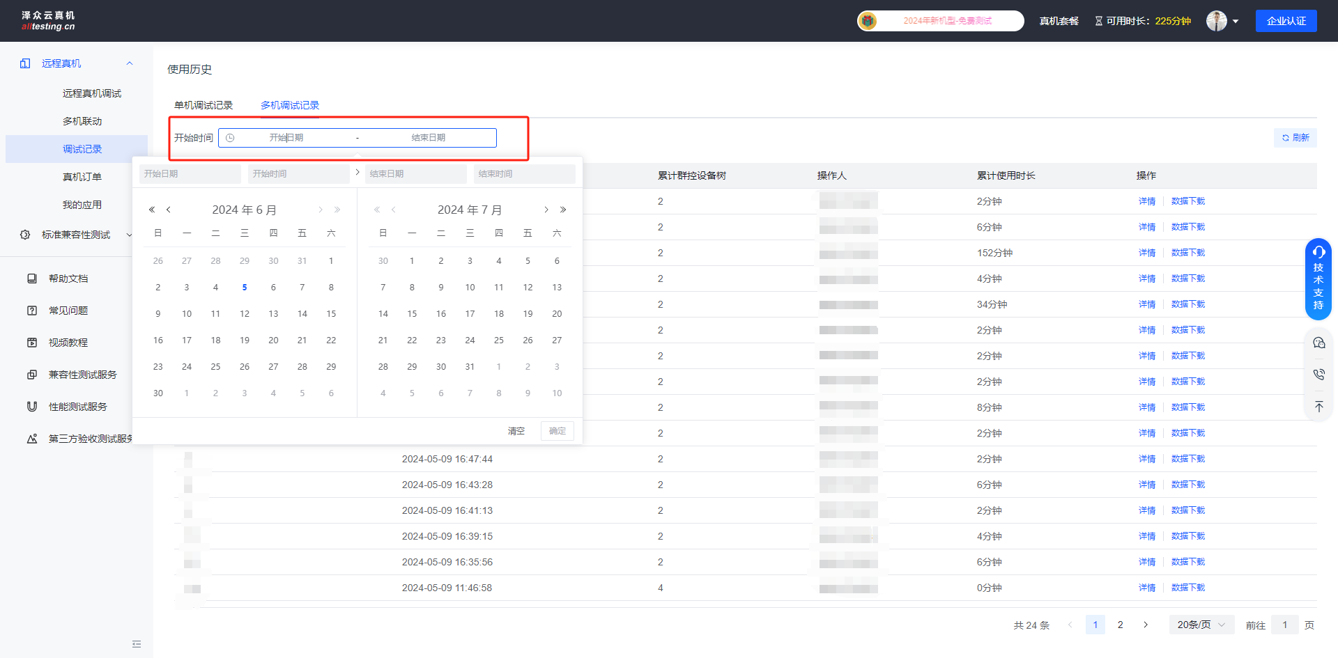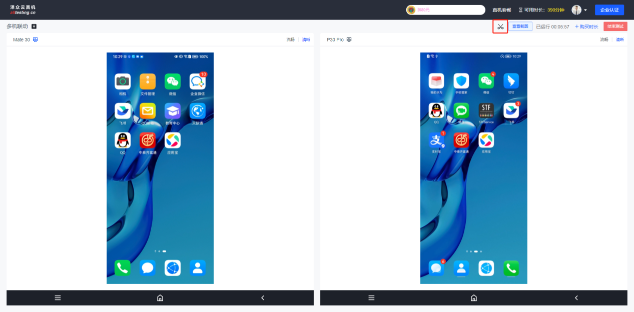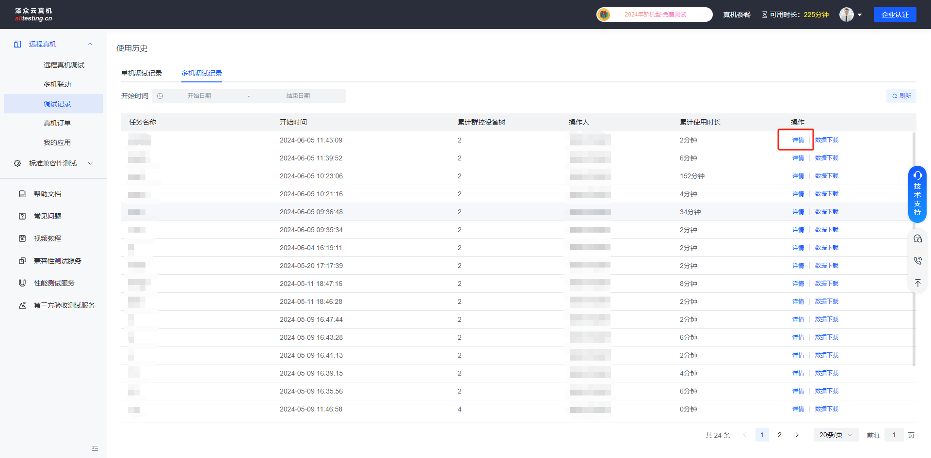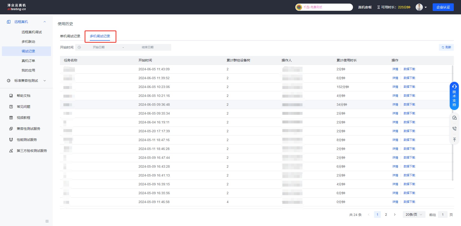 点击“远程真机”-“调试记录”-“多机调试记录”按钮即可查看多机联动使用历史;