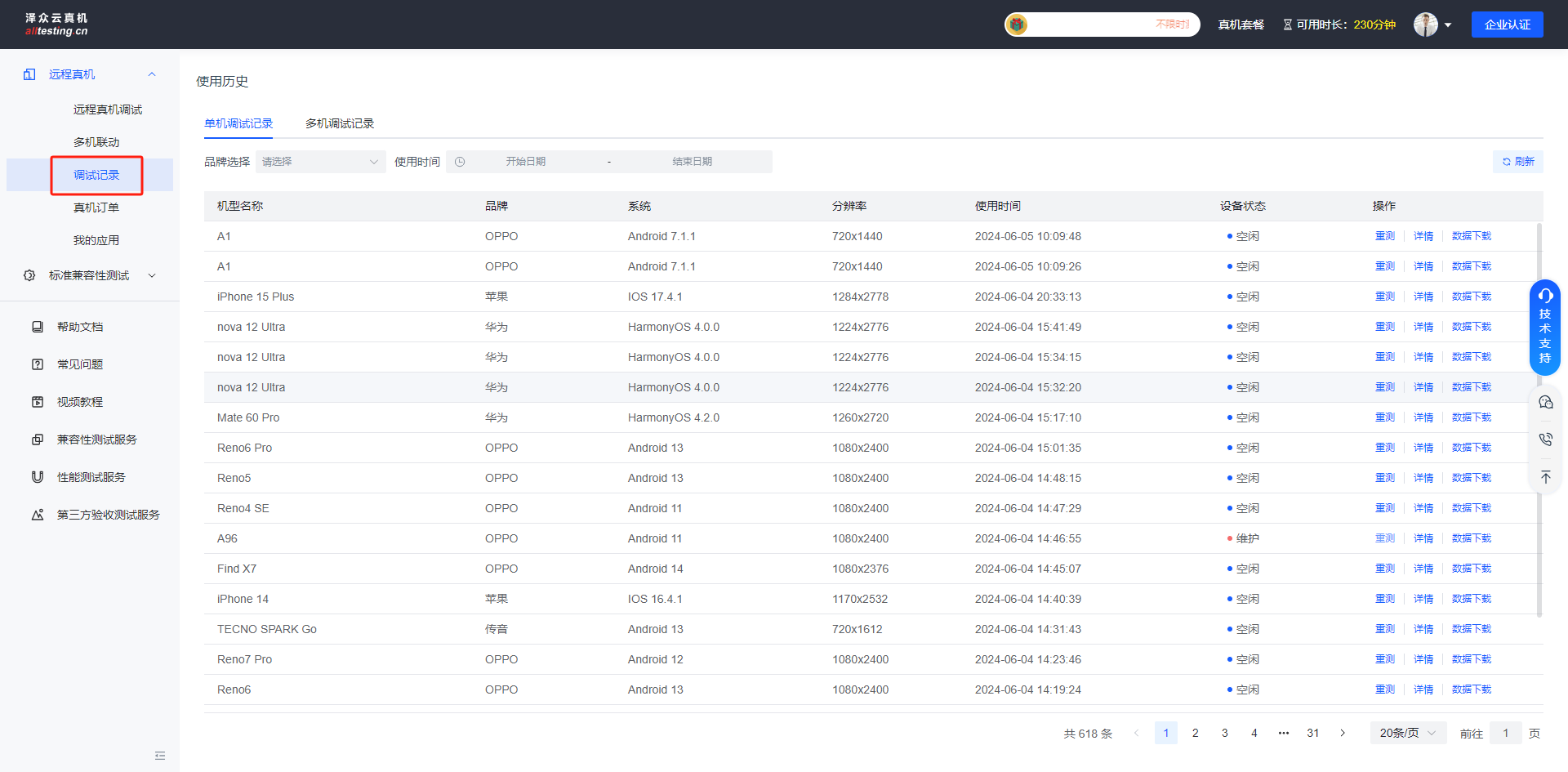 点击远程真机下的“调试记录”按钮,即可查看真机的使用历史;