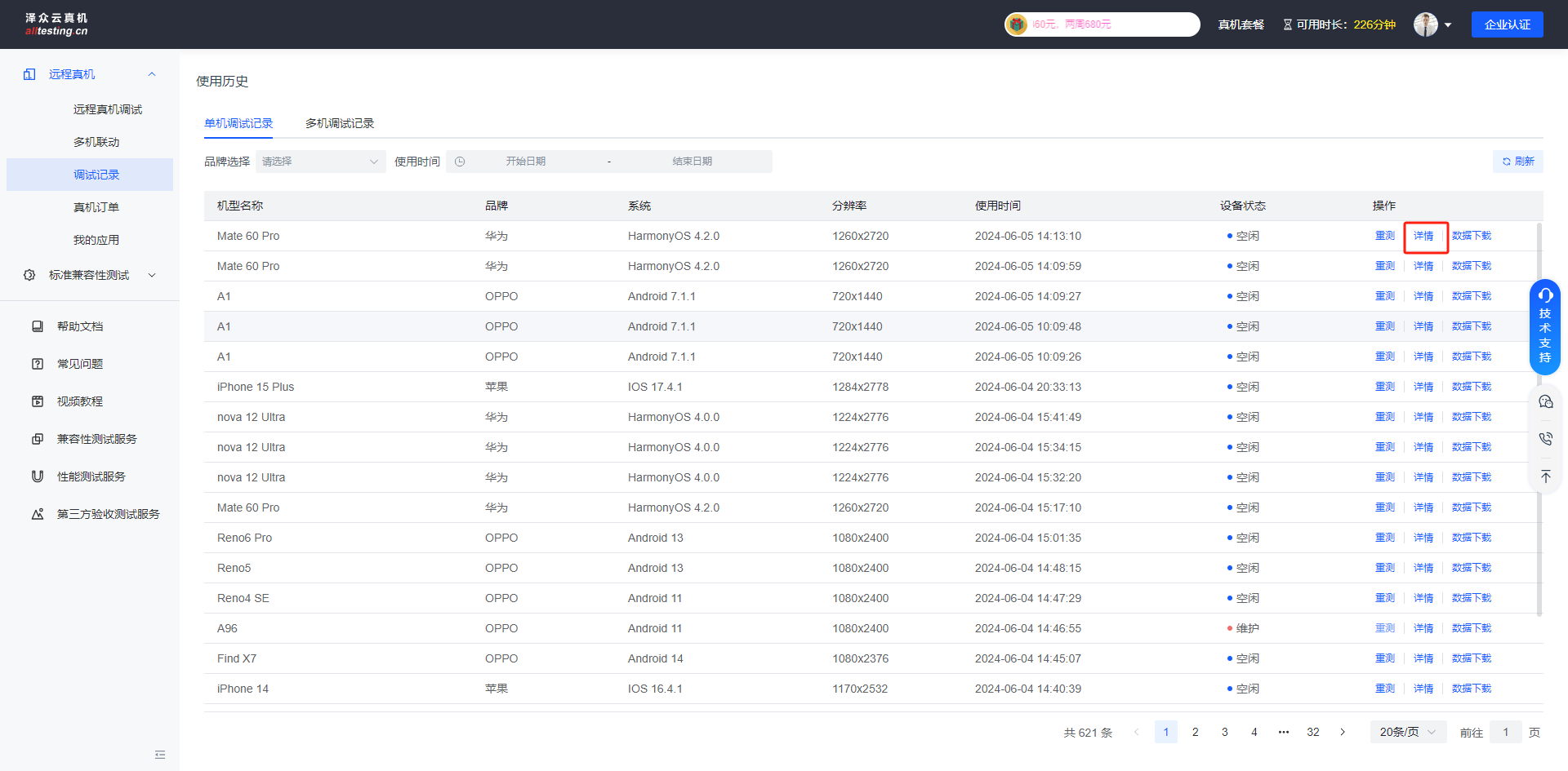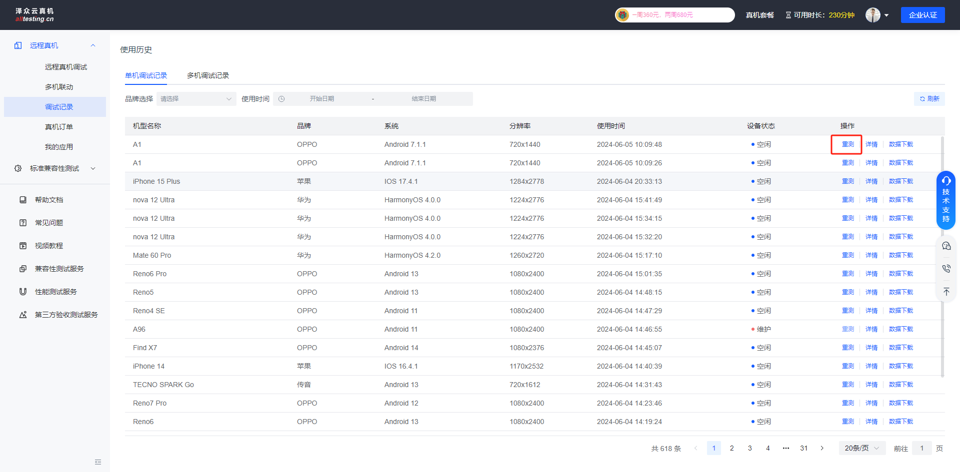 打开调试记录后默认显示单机调试记录,可以查看测试机型的相关信息、测试时间和其他操作;点击“重测”按钮可以重新进入真机进行测试;