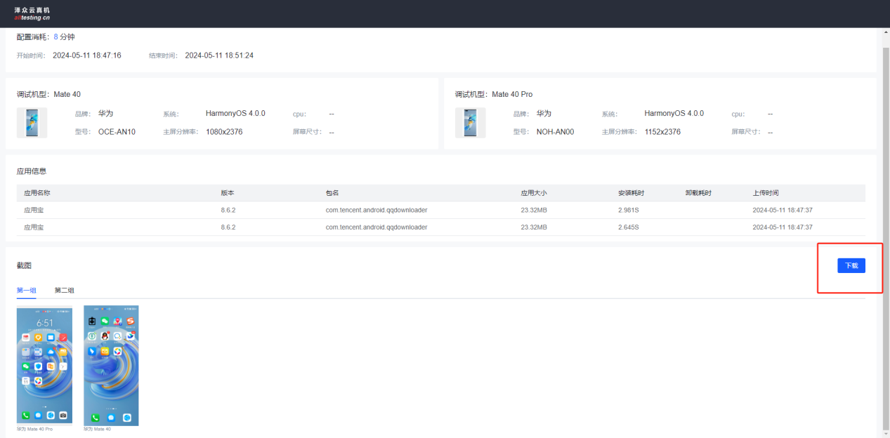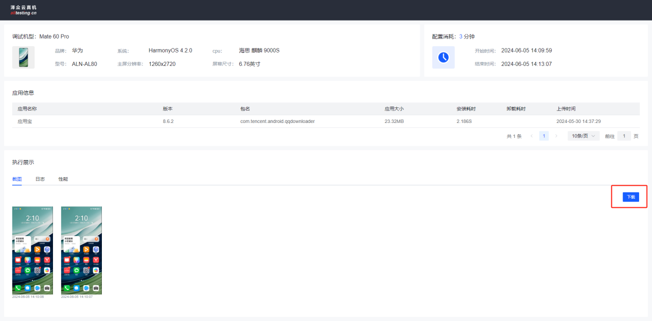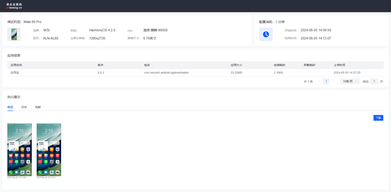 点击“详情”按钮可以查看此次调试的详细信息;包括调试机型的配置信息,消耗时长,安装的APP以及执行展示下的截图、日志和性能数据;