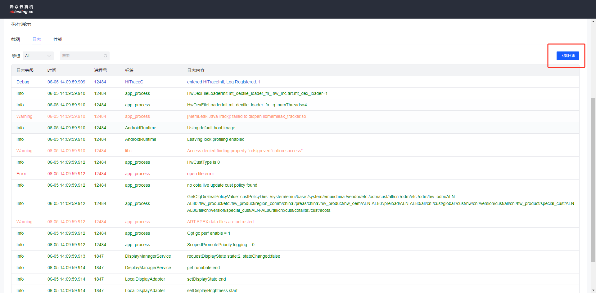 点击“下载日志”即可将获取到的日志下载到本地查看;