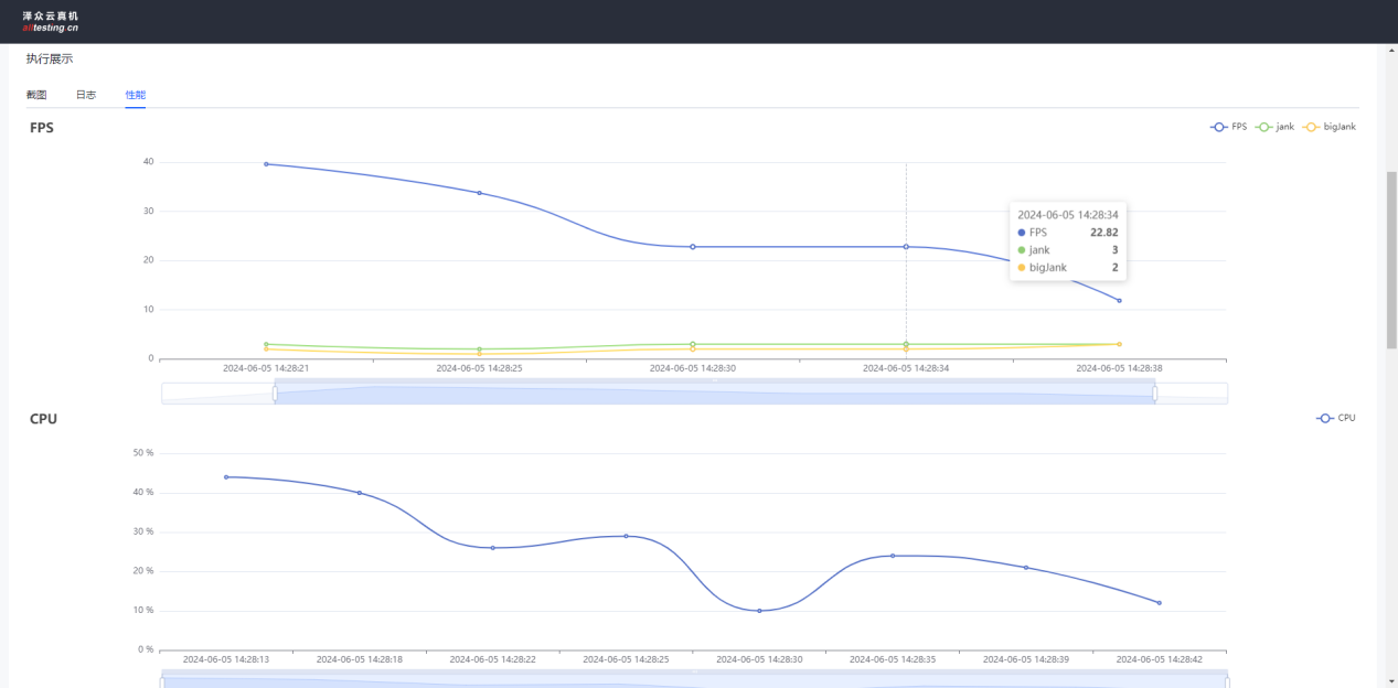 如开启性能测试,点击性能即可滑动查看性能数据;