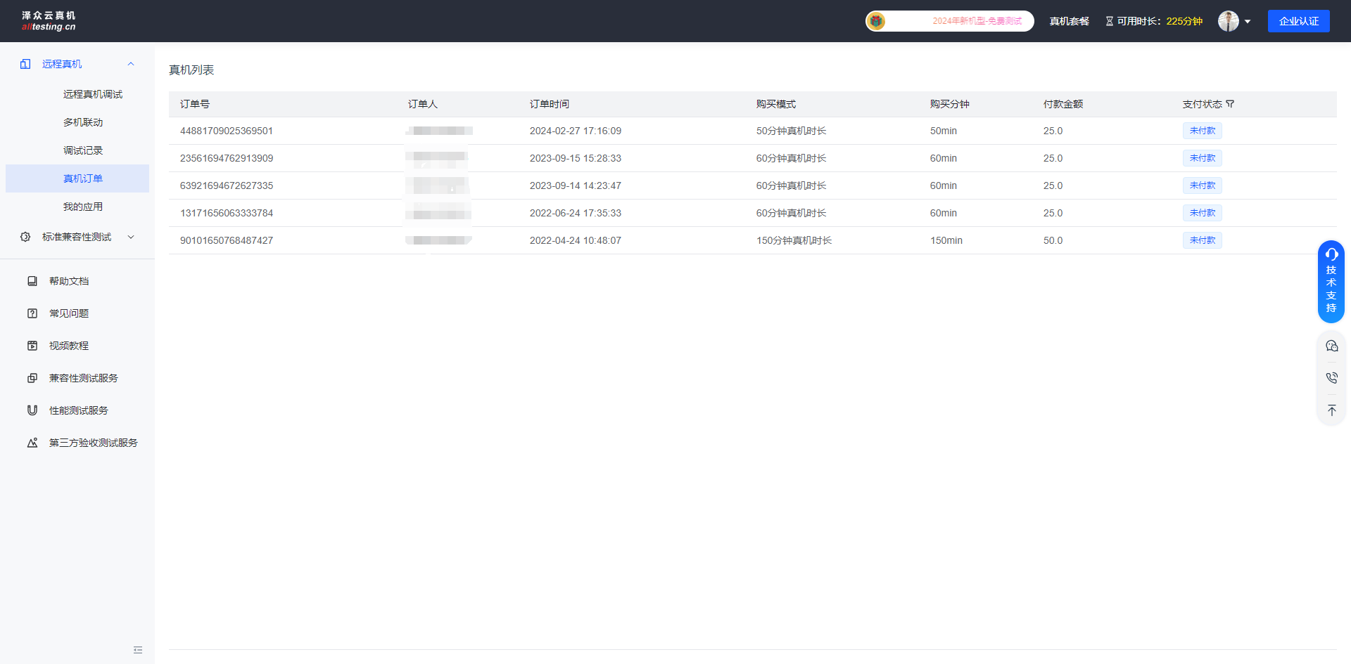 点击远程真机下的“真机订单”,即可查看所有订单信息;