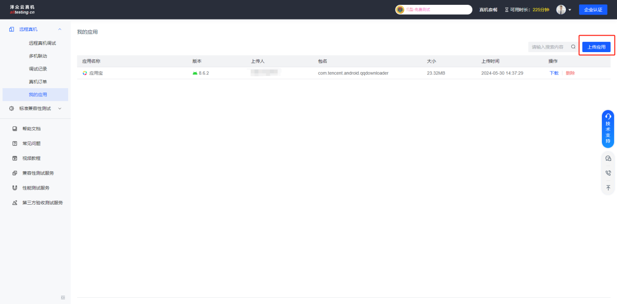 点击远程真机下的“我的应用”按钮,即可看到已上传的应用信息;