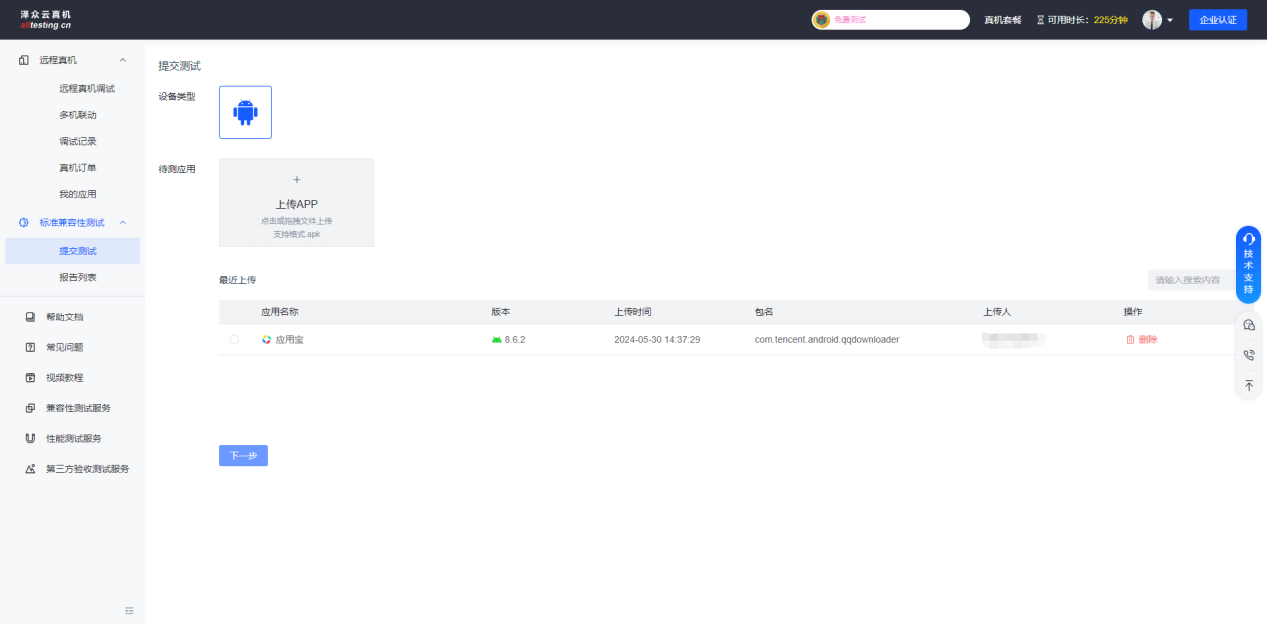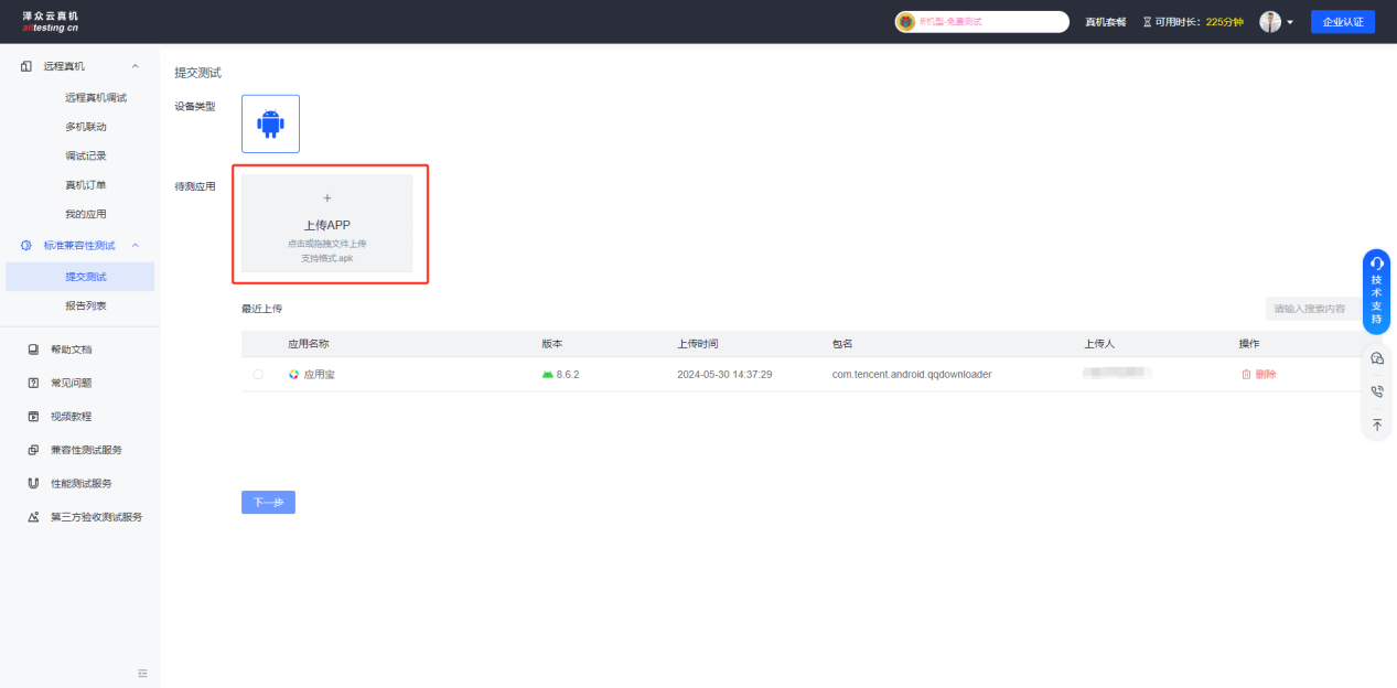 点击“上传APP”按钮可首先对需要测试的APP进行预上传;已上传的APP会显示在下方应用列表中,选择APP后点击下一步继续发起测试;