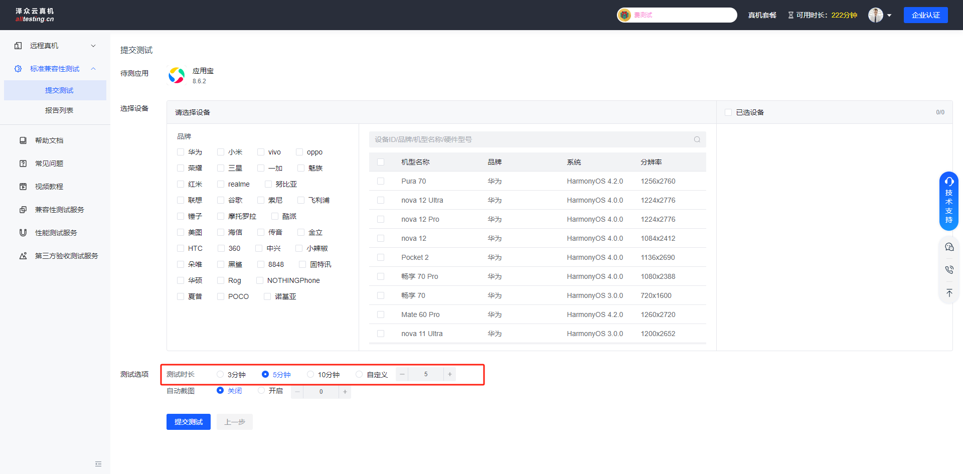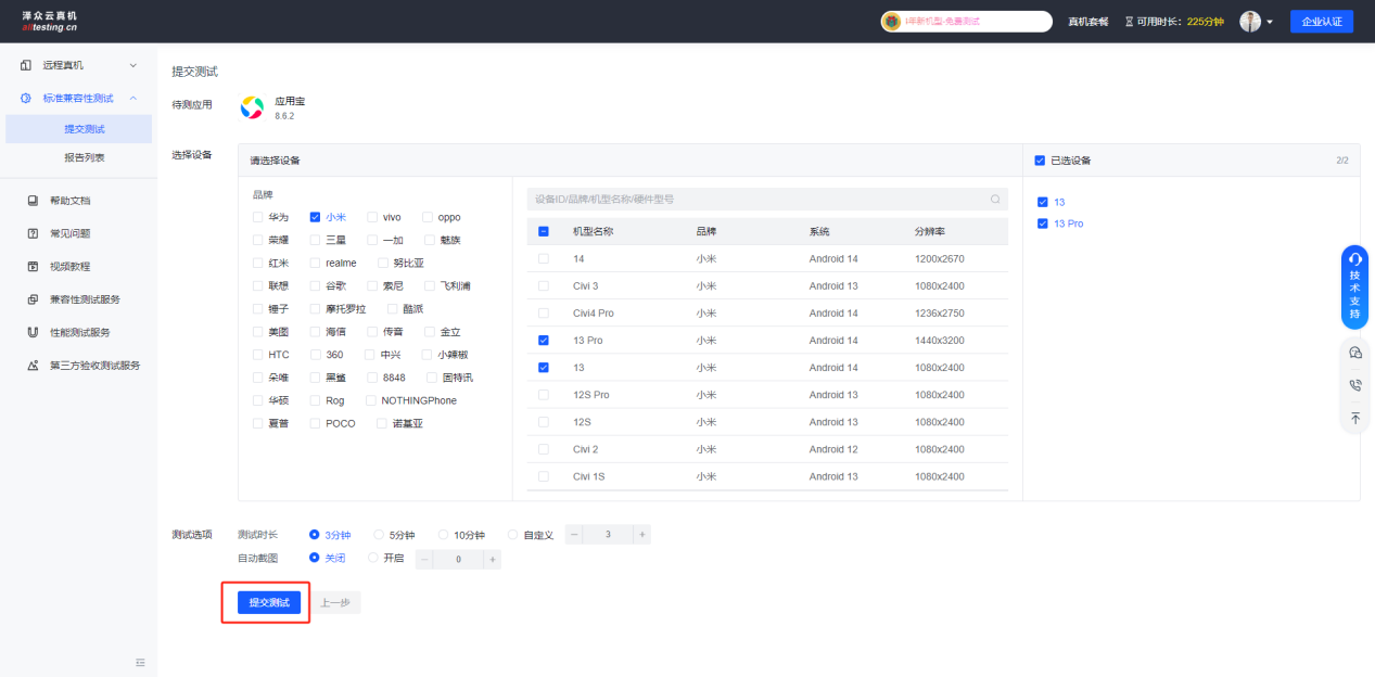 待测应用选择完成后,根据品牌型号勾选需要测试的机型,选择测试时长、是否开启自动截图即可成功发起测试;