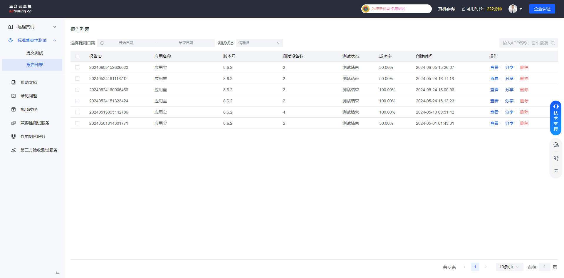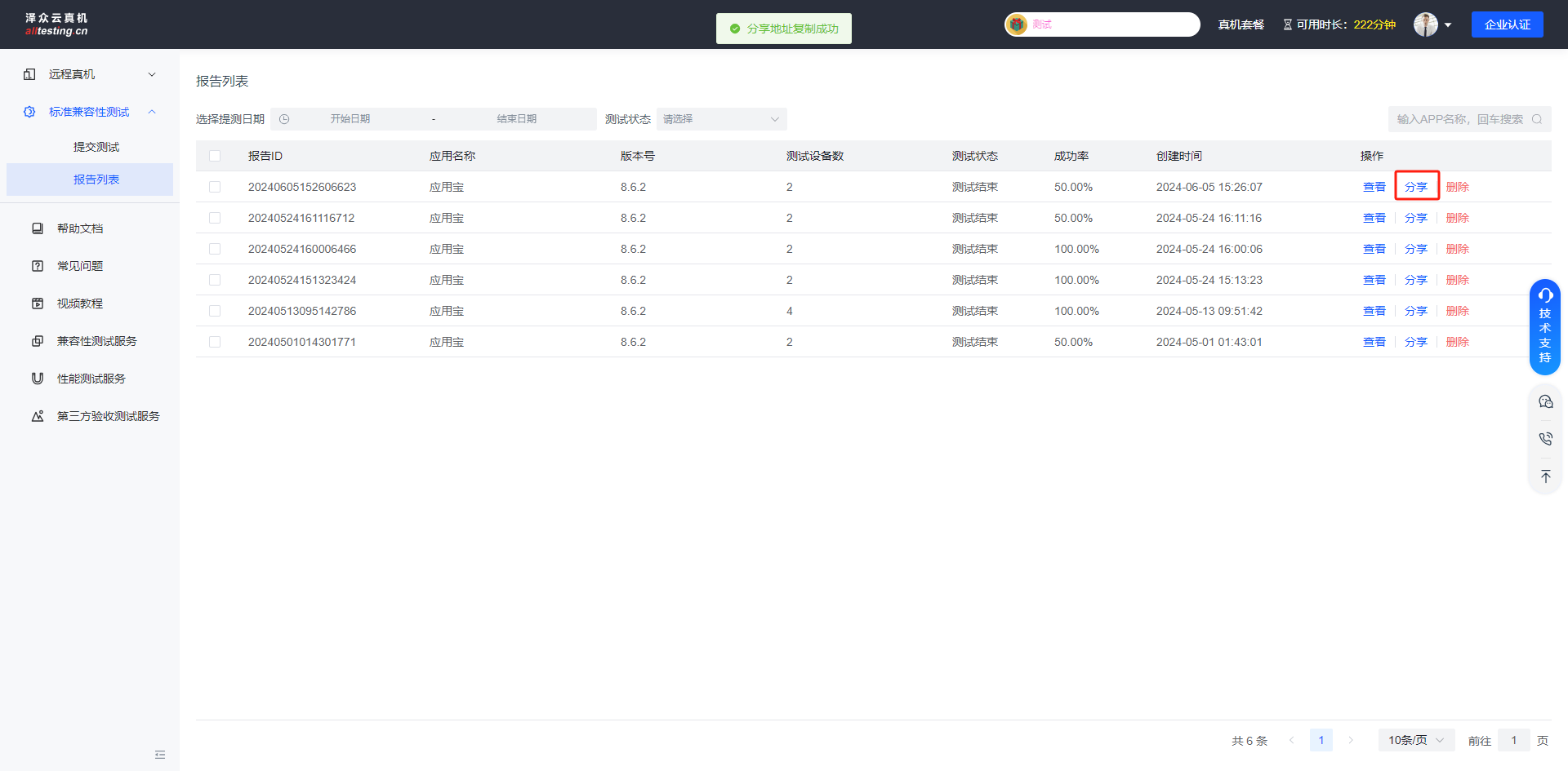 测试发起完成后,即可在报告列表中查看测试记录;