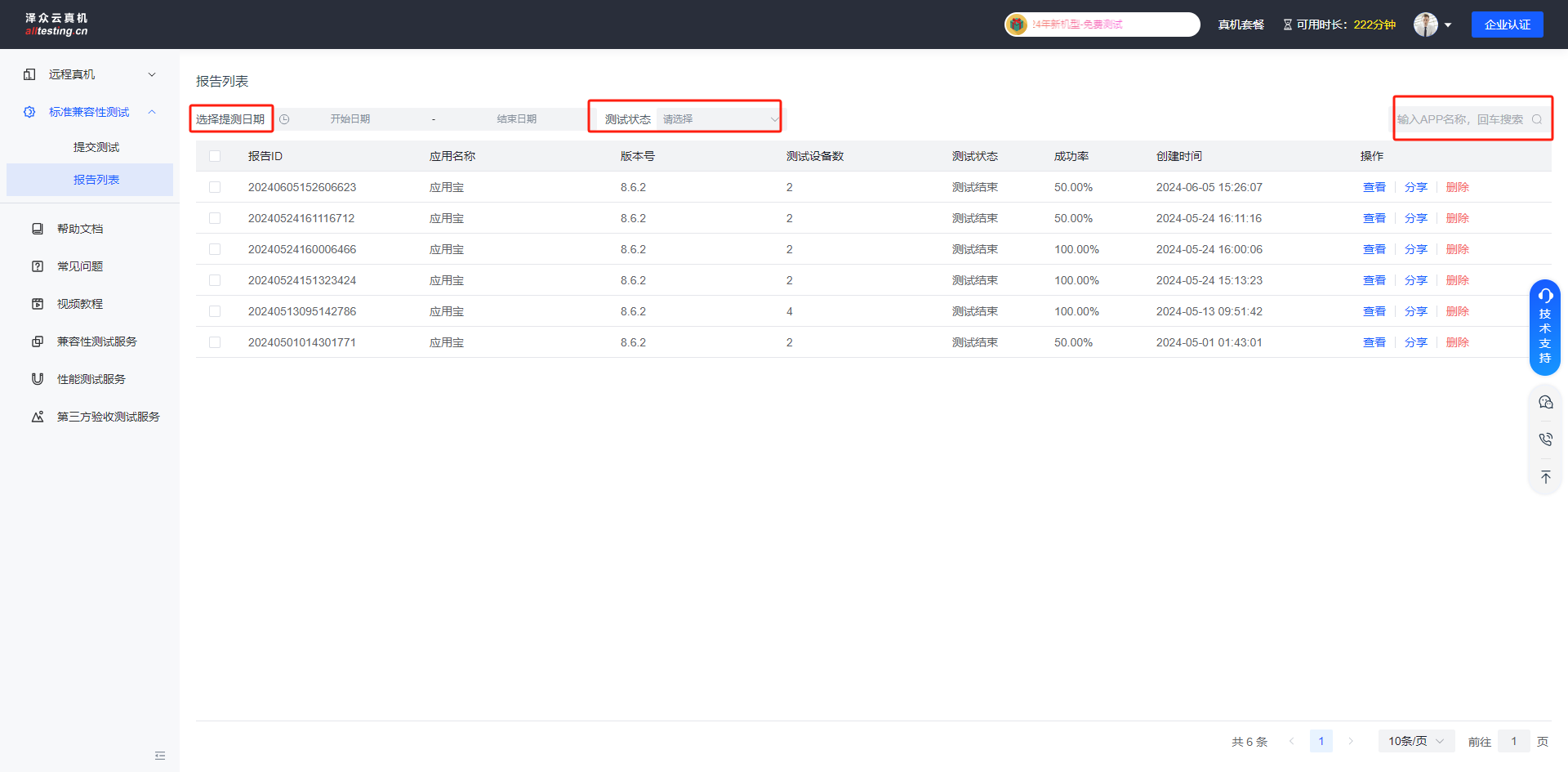 可根据测试日期、测试状态、APP名称等筛选测试记录;