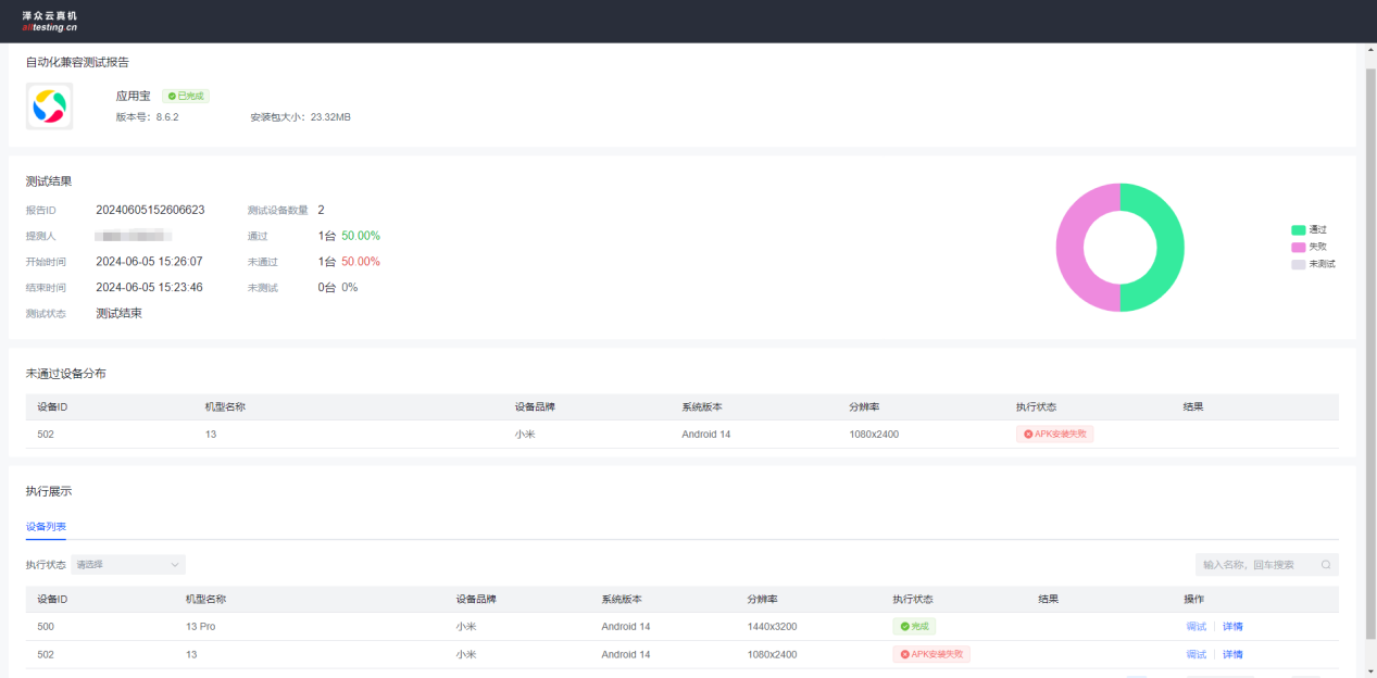 自动化兼容测试报告中,主要展示了测试结果、未通过设备的原因及设备列表;