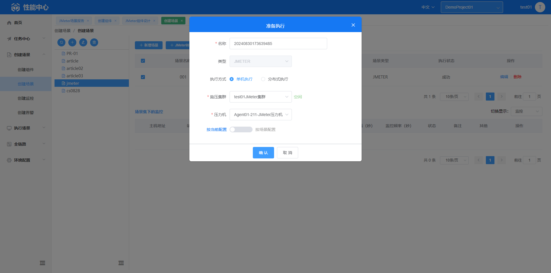 完成设计组件后,进入创建场景页面,新增JMeter场景集目录,在该目录中新增场景,并绑定组件及配置执行方式、施压集群、压力机。